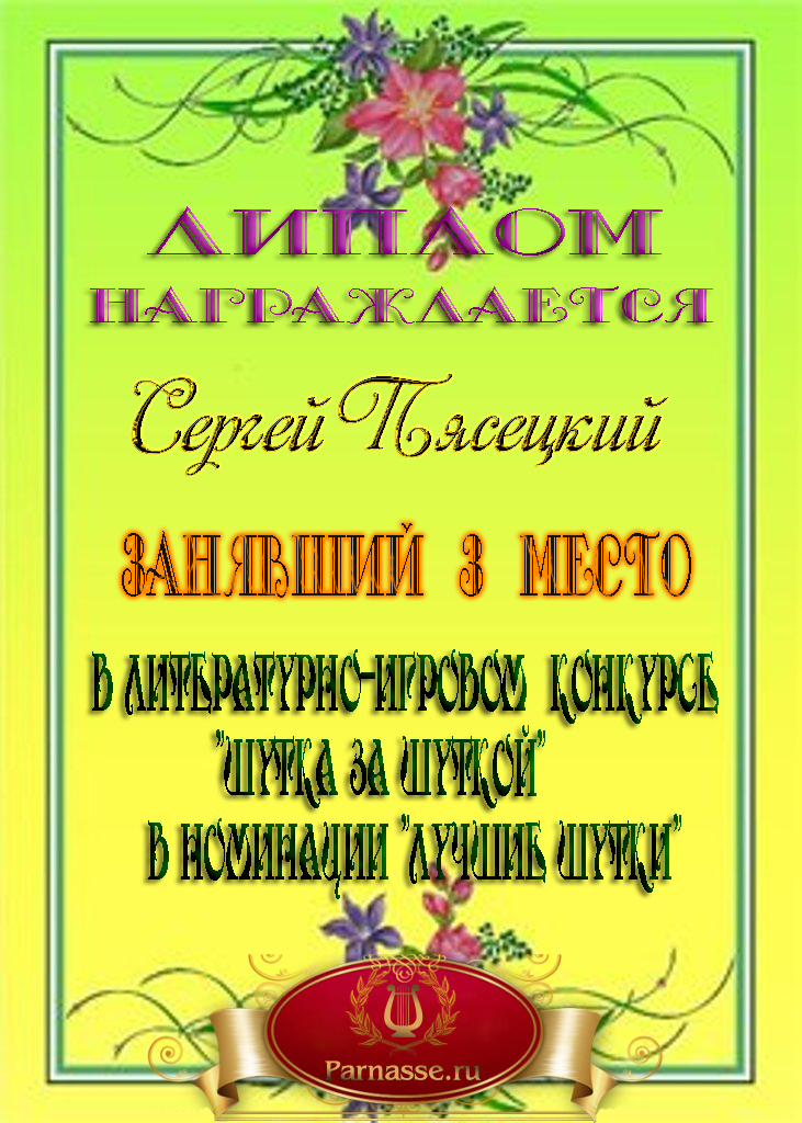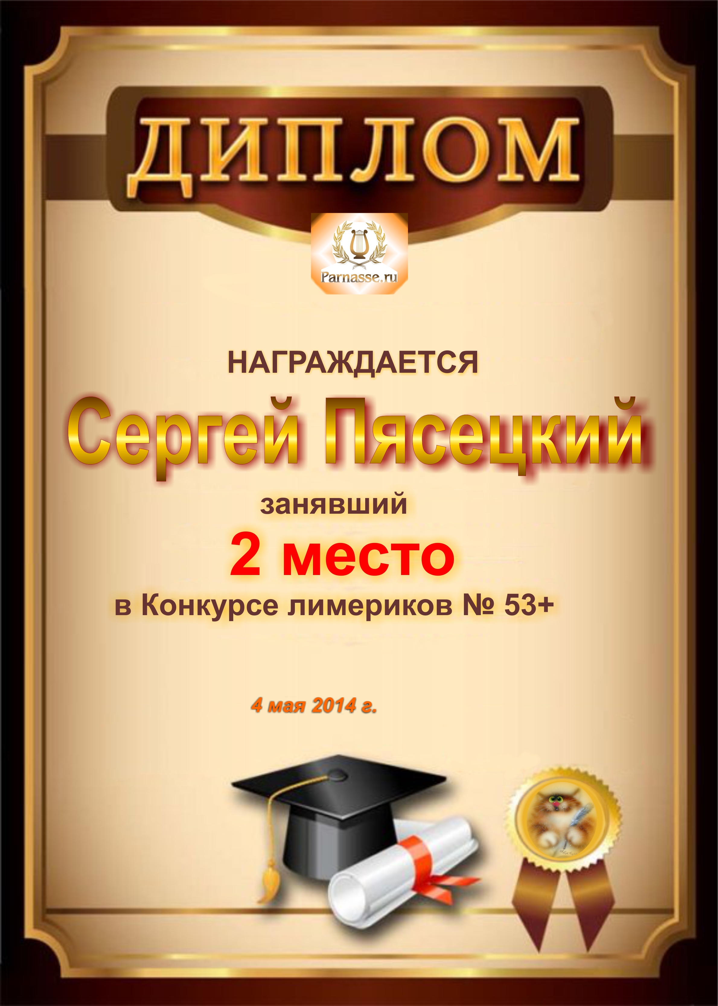 Диплом за победу и 3 место в дополнительной номинации конкурса лимериков № 53+ (4.05.2014 г.)