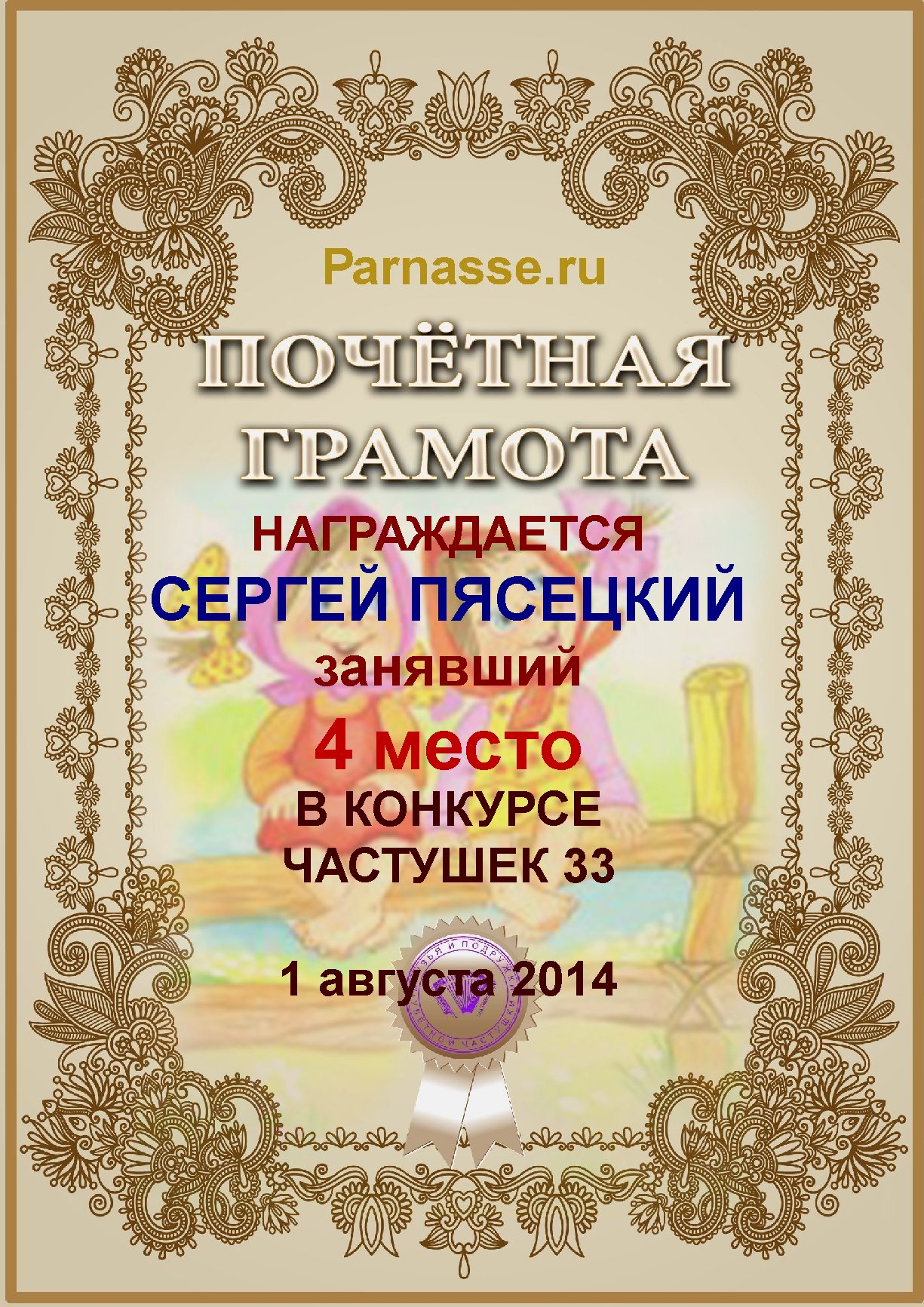 Похвальная грамота за 4 место в конкурсе лимериков № 58+ (24.08.2014 г.)