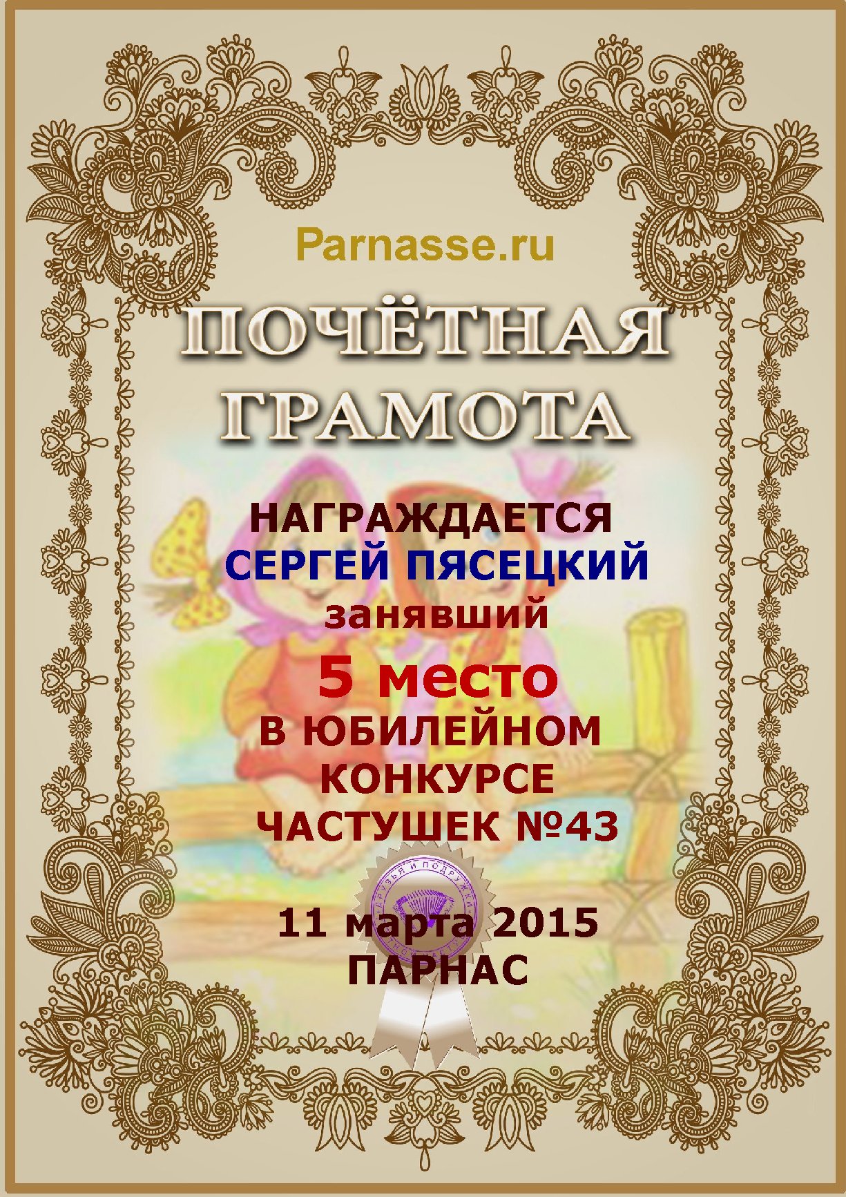 Похвальная грамота за 5 место в конкурсе лимериков № 66+ (2.03.2015 г.)