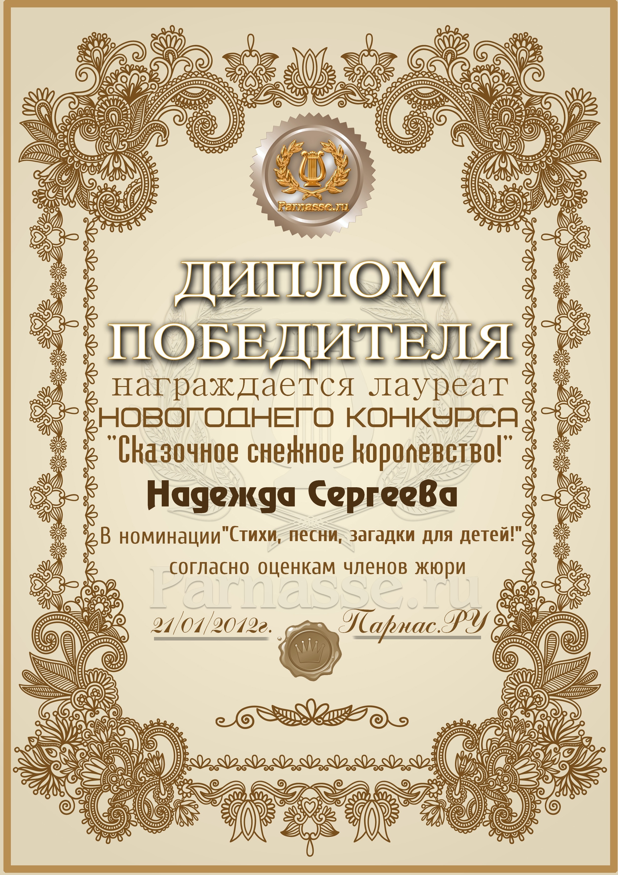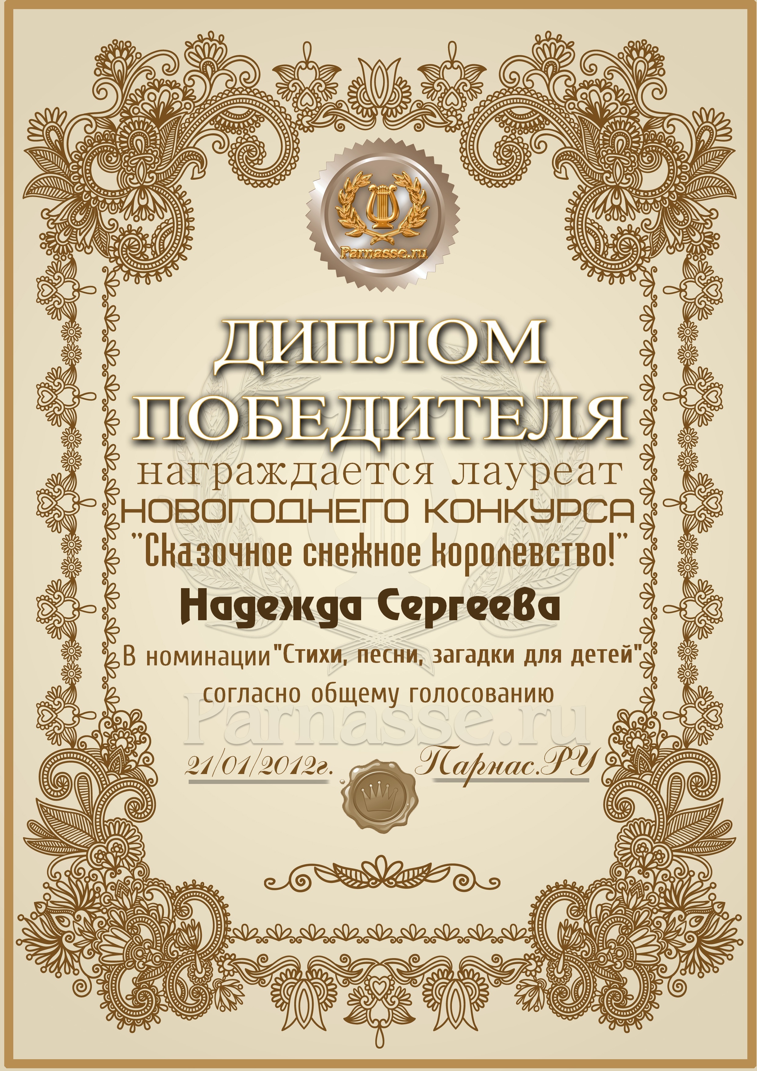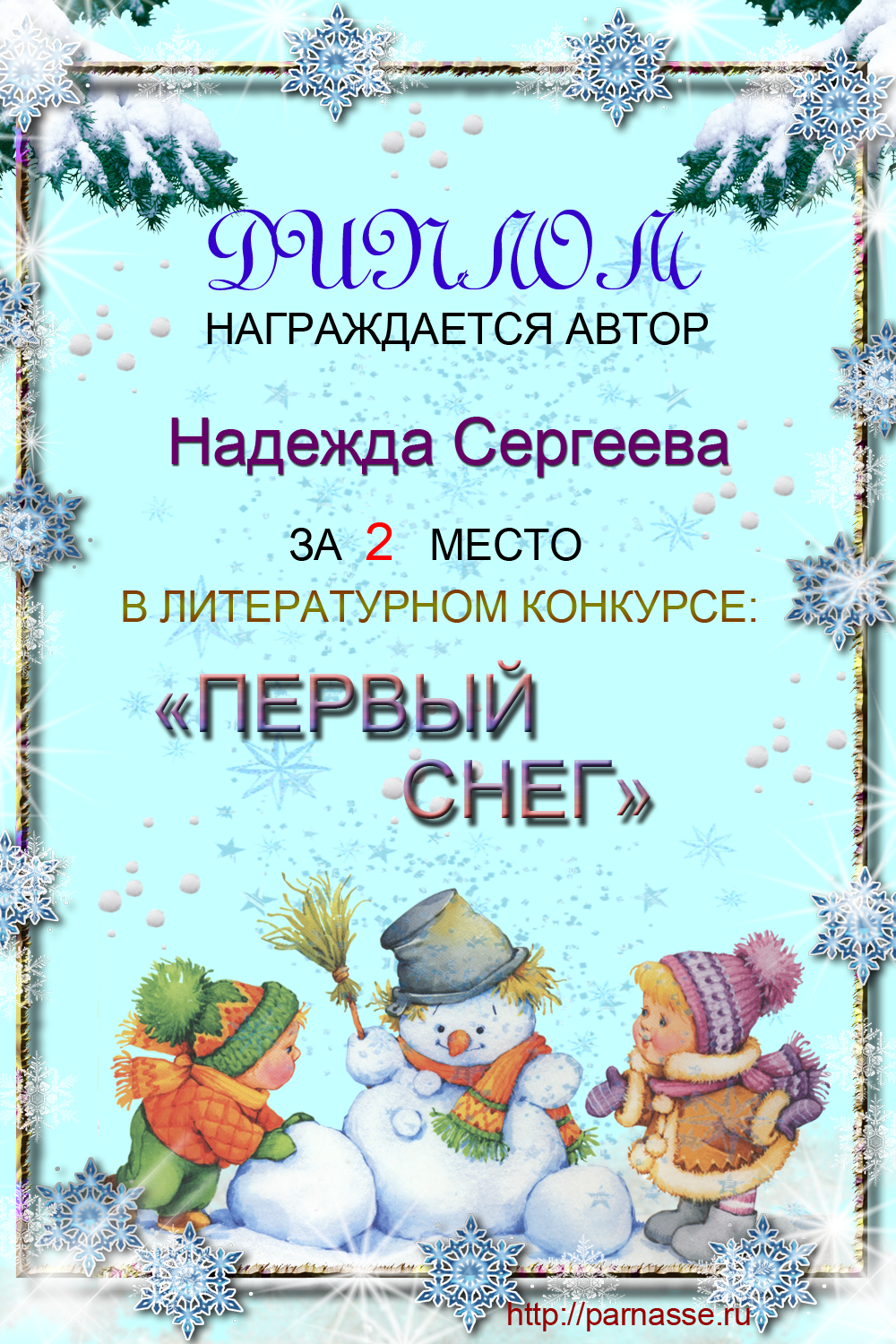 Лауреату новогоднего конкурса "Сказочное снежное королевство!" за первое место в номинации "Стихи, песни, загадки для детей" согласно общему голосованию.Произведение «Зимняя считалочка».