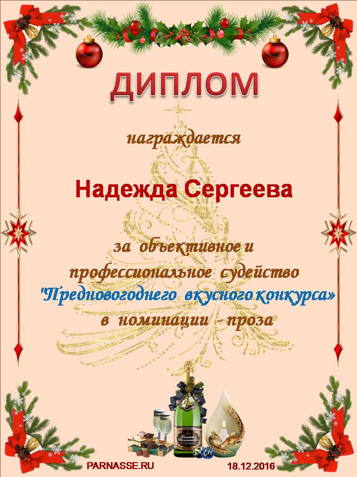 Благодарим Вас, Надежда, за профессиональное и объективное судейство номинации "Вкусные рассказы, сказки - проза с рецептом" в конкурсе "Предновогодний вкусный". Огромное спасибо! От всей души поздравляем Вас с наступающим Новым 2017 Годом! Счастья и радости, здравия и всех благ, удачи на все года! С большой благодарностью, признательностью.