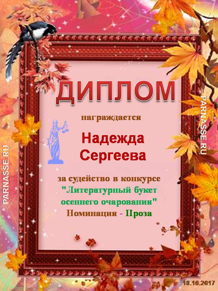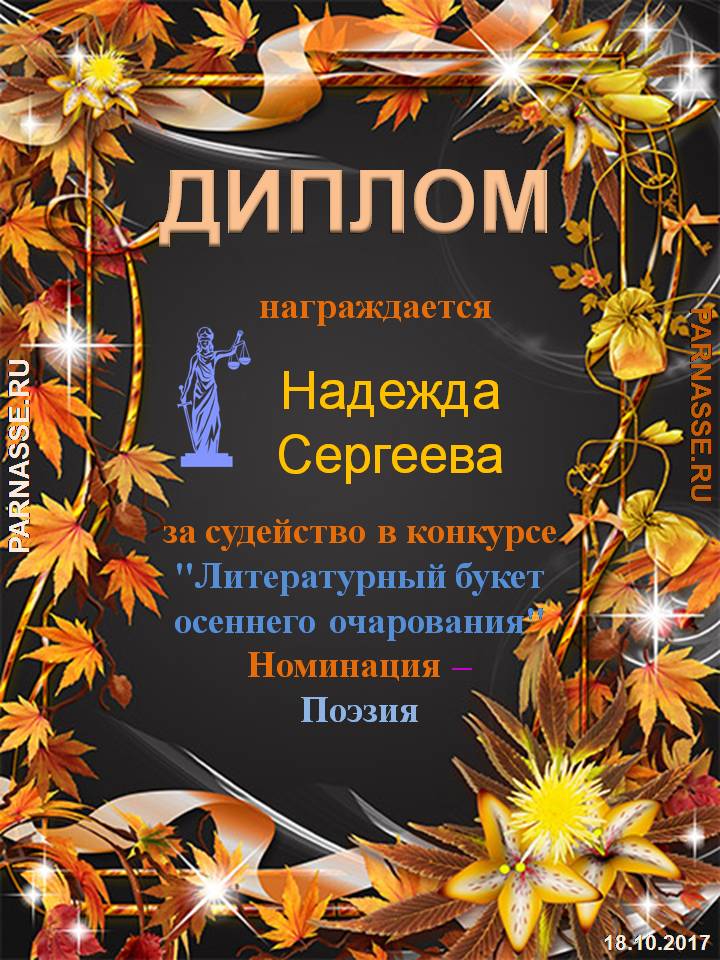 Благодарим Вас за квалифицированное, оперативное, беспристрастное судейство поэтической номинации "Поэтический осенний вальс" в музыкально-литературном конкурсе "Уж слышен Осени мотив". Большое спасибо, Надежда, за судейство, за потрясающе красивые, талантливые стихи. Удачи Вам, успехов, всех благополучий в жизни и делах.
