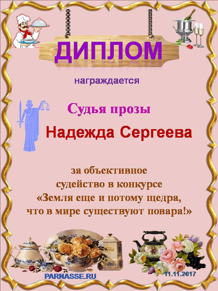 Уважаемая Надежда! Благодарим Вас за квалифицированное судейство конкурса "Земля еще и потому щедра, что в мире существуют повара!", номиция "Поздравления в стихах: Поварам — хвала и честь". Желаем успехов, процветания, крепкого здоровья и всего самого наилучшего!