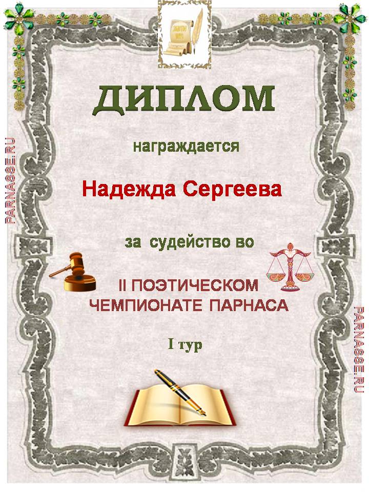 Диплом за судейство во II Поэтическом Чемпионате Парнаса. I тур . Тема "Нежность весны"