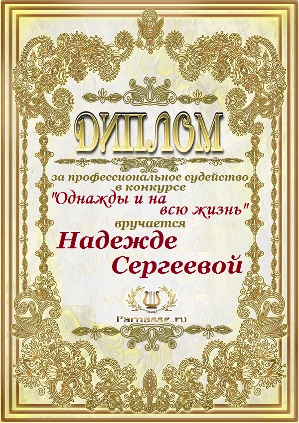 За беспристрастное профессиональное судейство конкурса "Однажды и на всю жизнь". За мудрость, тактичность и терпение. За литературно-писательское мастерство и высокий профессионализм. Спасибо за помощь и поддержку!