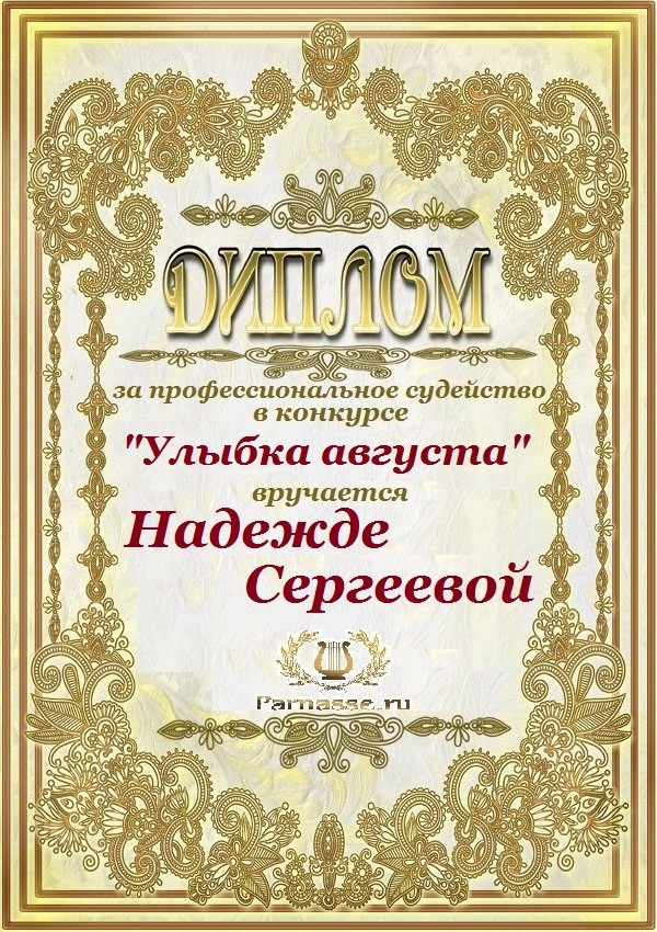 За профессиональное, компетентное, квалифицированное, справедливое судейство прозаической номинации "Сказание о Лете" ЛитКонкурса "Улыбка августа"! Огромное СПАСИБО, Уважаемая Надежда!