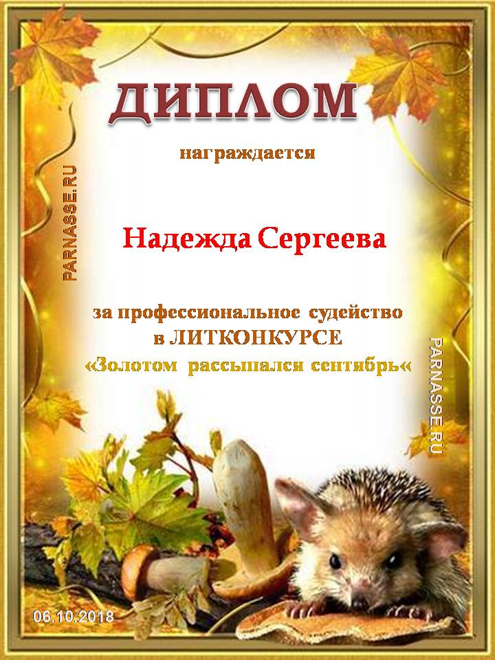За компетентное, квалифицированное, справедливое судейство прозаической номинации "Очей очарование" ЛитКонкурса "Золотом рассыпался сентябрь". Огромное СПАСИБО, Уважаемая Надежда!