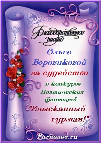 Позвольте Вас от всей души поблагодарить за участие в юбилейном конкурсе, за великолепные поздравления и пожелания нашему "Парнасу", разменявшему уже третий год – серьезный возраст по мерам Интернета! Очень признательны за Ваши прекрасные слова, желаем Вам всех-всех благ в будущем и новых высот в творчестве! Спасибо!