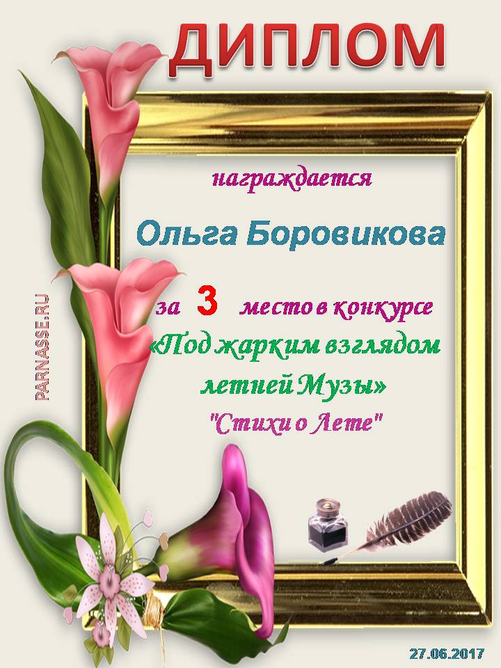 Победителю конкурса: "Под жарким взглядом летней музы". Поздравляем с 3 местом в номинации - "Стихи о лете"