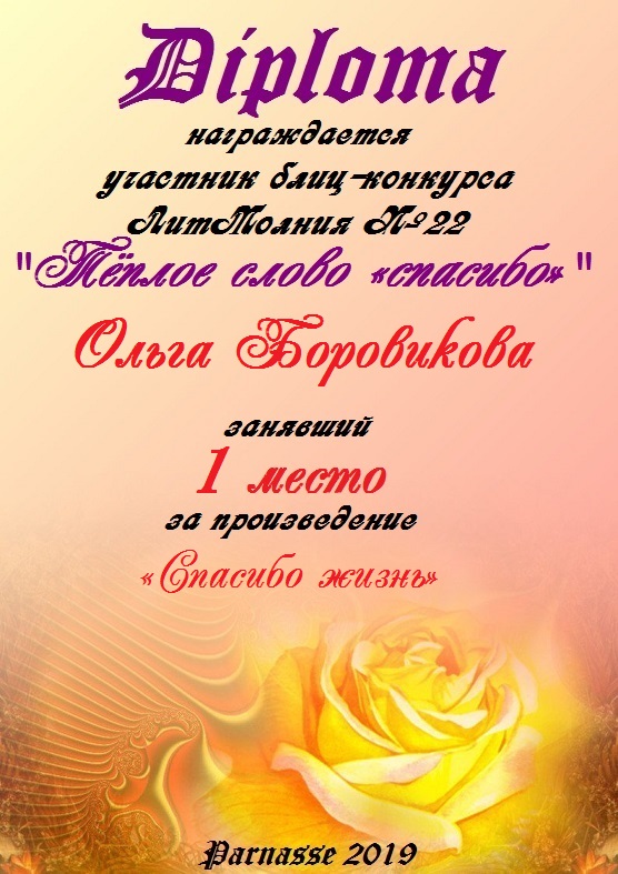 Подарок/пожелание от: Лора Дан Время: 20 января 2021 в 13:38 Пожелание: Время проходит, и конкурса дни Мы завершаем. Пусть будут они В памяти Вашей как символ тепла, Радости, дружбы, пусть будет светла Ваша дорога - идите смелей! Будет прекрасным течение дней!.. |