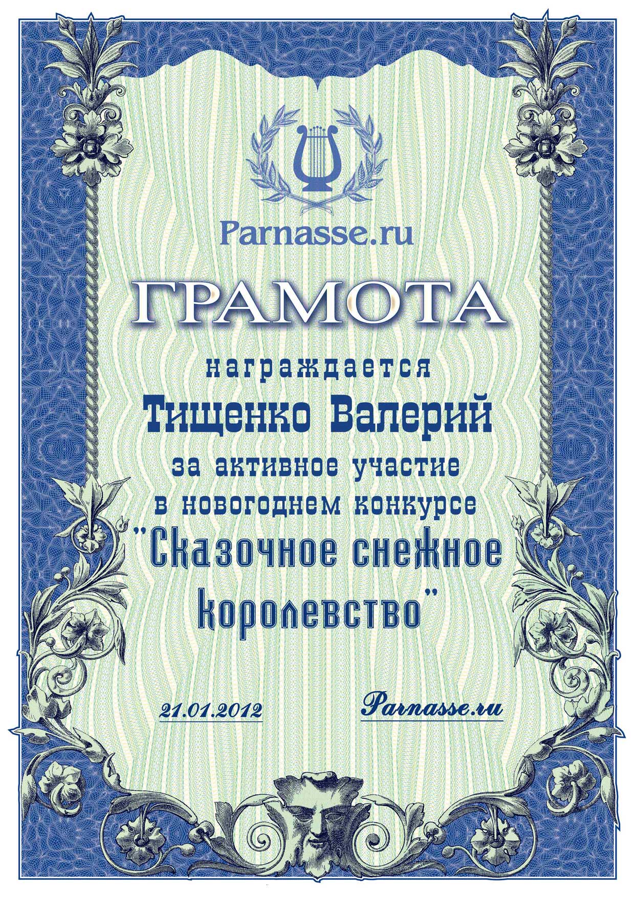 От лица Администрации творческого портала "Парнас" вручаем Вам этот памятный знак с самыми наилучшими пожеланиями! Пусть Вас весь год не покидает творческий запал, удача, а здоровье будет столь же крепким и нерушимым, как и традиция Новогоднего праздника! Счастья, успехов и любви Вам и Вашей семье, друзьям и близким!