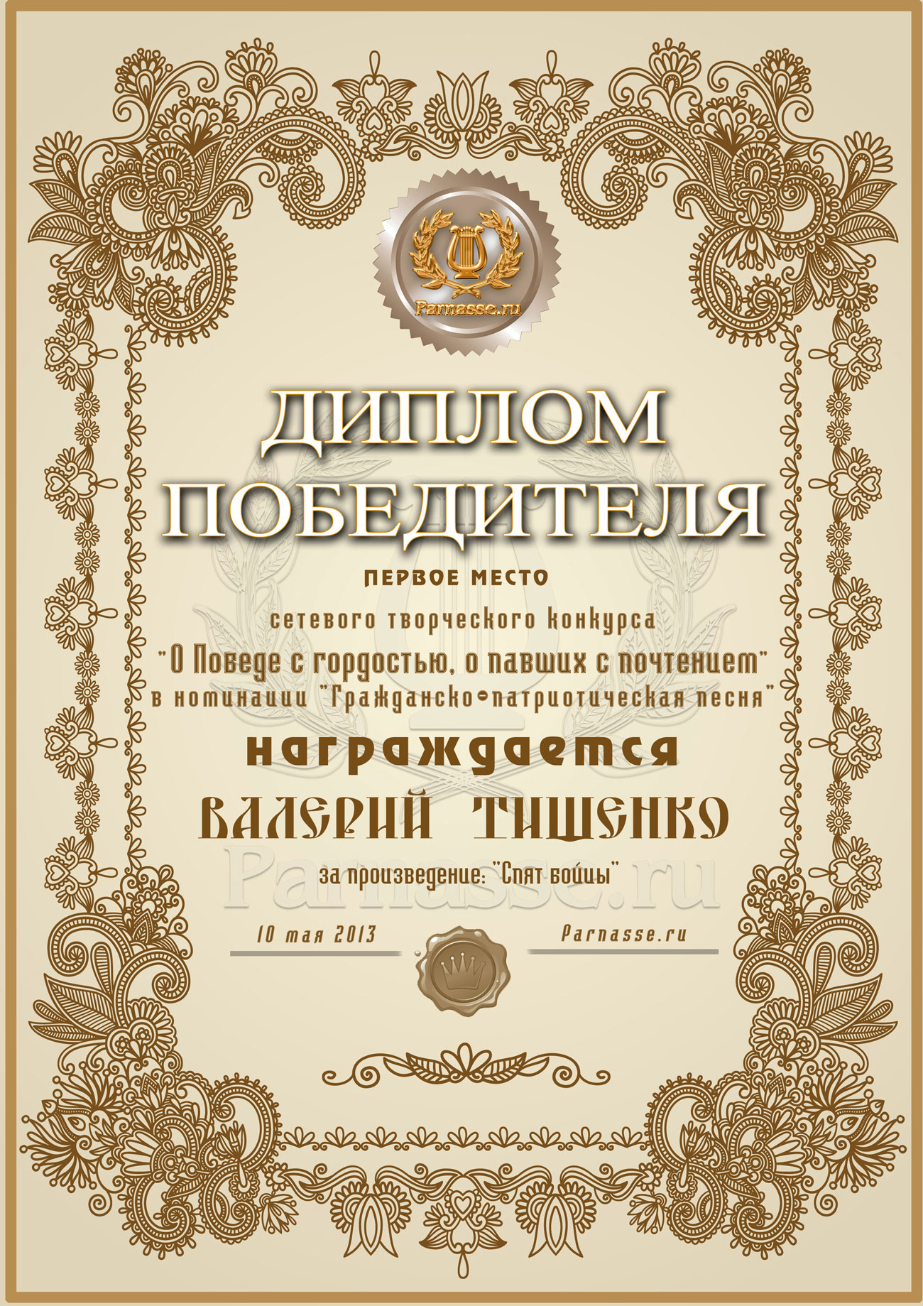 Первое место в музыкально-литературном конкурсе «О Победе с гордостью, о павших – с почтением!» Судейское голосование. Номинация «Песня гражданско-патриотической тематики»! Композитору песни «СПЯТ БОЙЦЫ»! Поздравляем с заслуженной Победой в конкурсе!