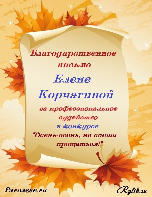 Уважаемая Елена!Спасибо Вам большое за высокопрофессиональное, объективное судейство конкурсов на Парнасе!
