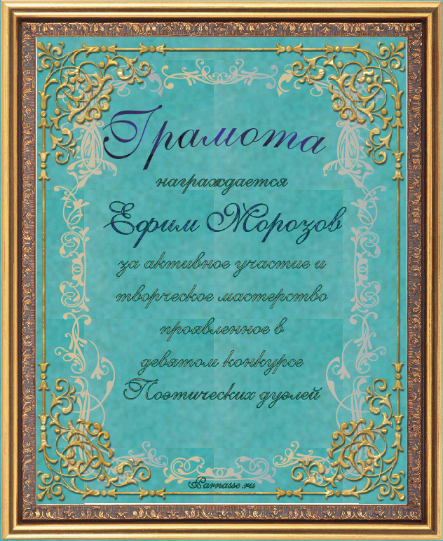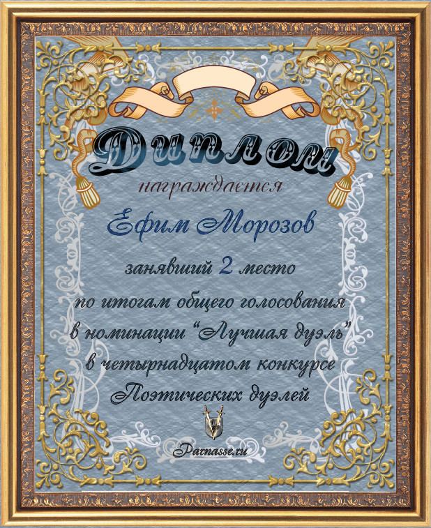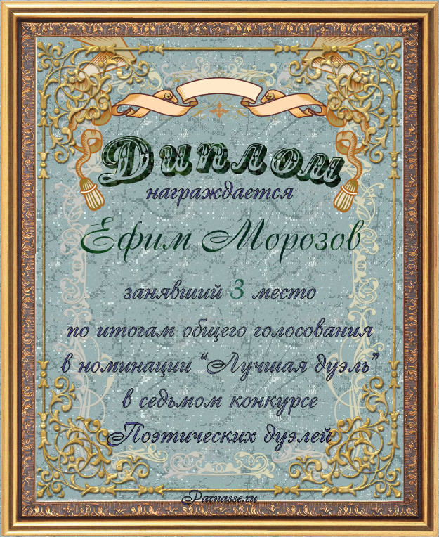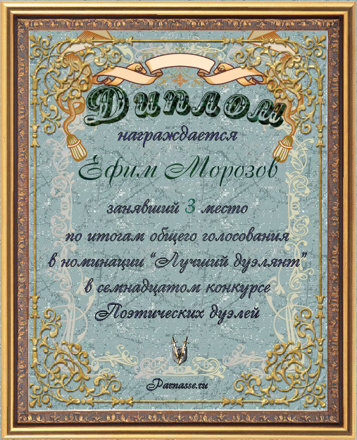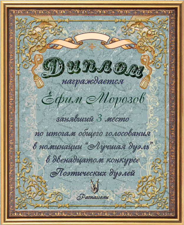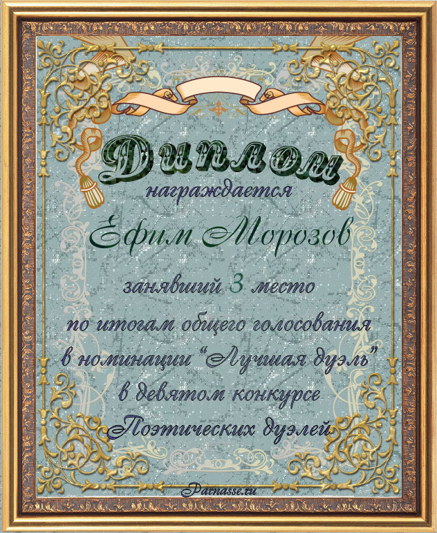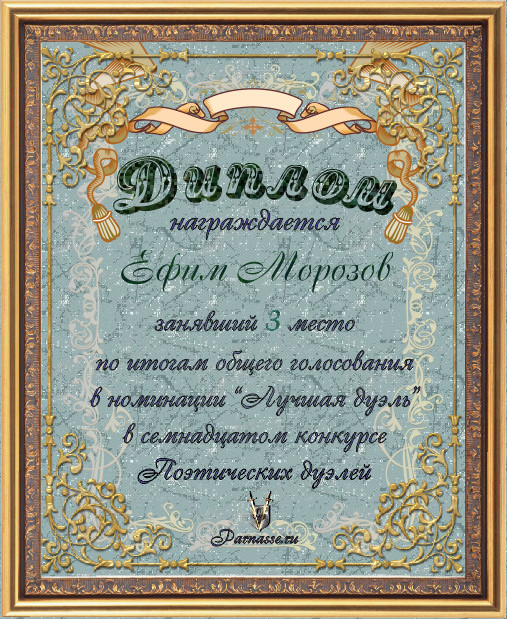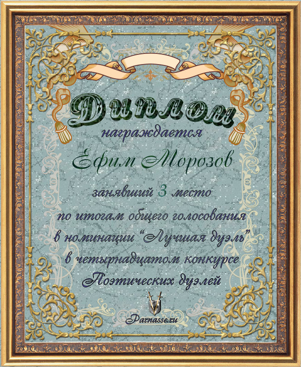 Диплом за 3-е место в номинации "Лучшая дуэль" по итогам общего голосования в девятом конкурсе поэтических дуэлей(№ 13.3)