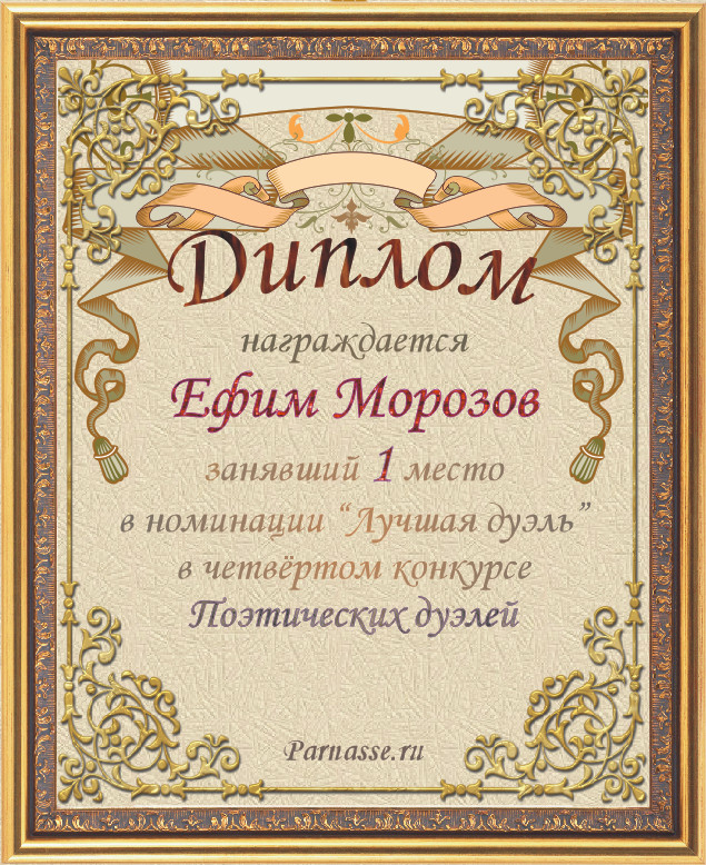 Диплом за победу в номинации "Лучшая дуэль" в четвёртом конкурсе Поэтических дуэлей