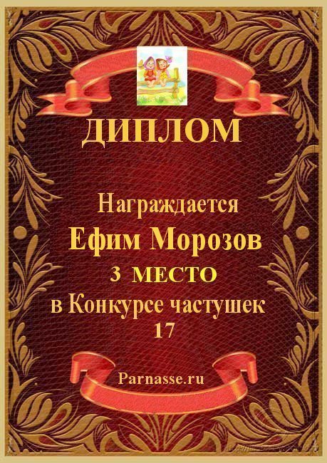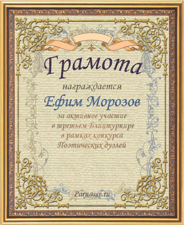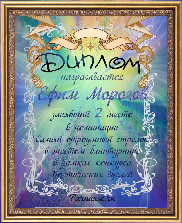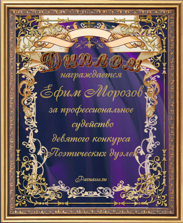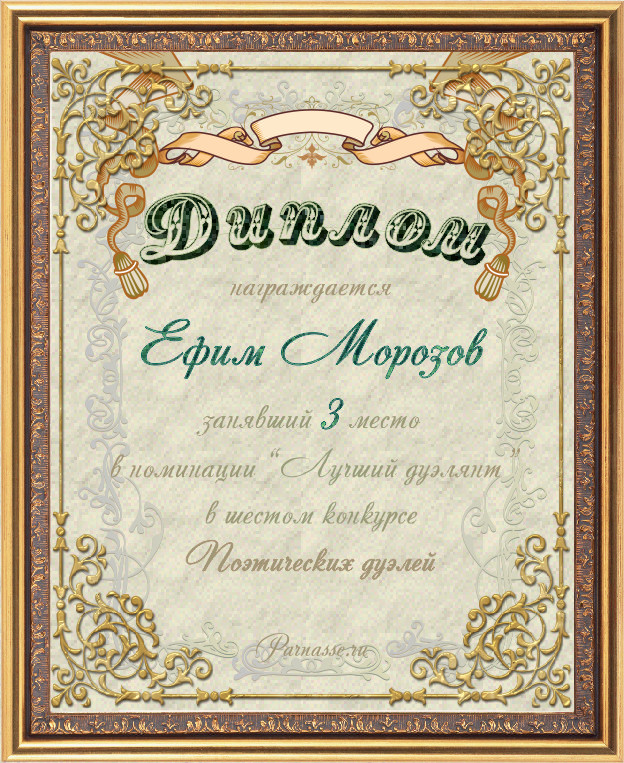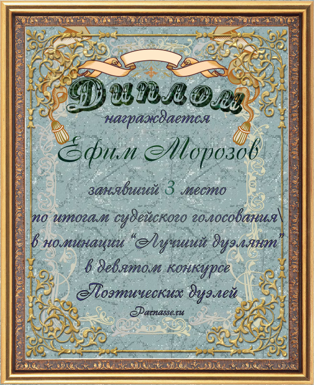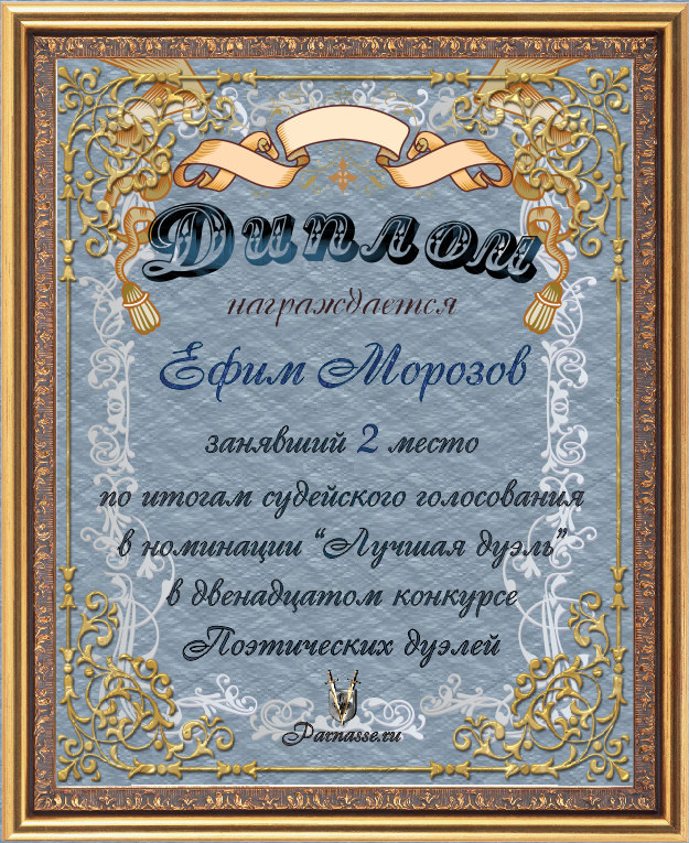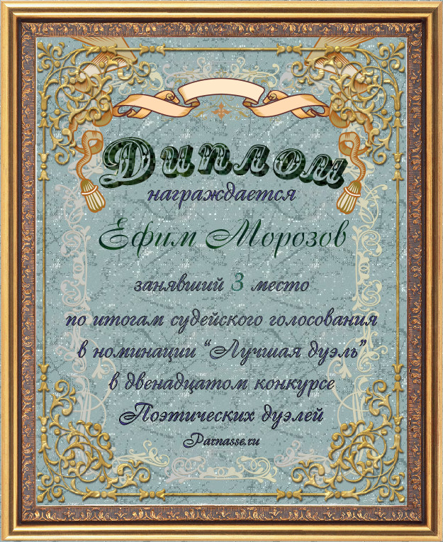 Диплом за 3-е место в номинации "Лучшая дуэль" по итогам судейского голосования в девятом конкурсе поэтических дуэлей(№ 8.2)