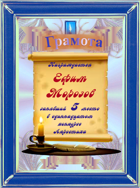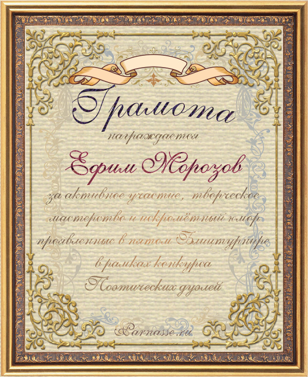 За неугасающую и неисчерпаемую творческую активность, постоянный контакт с Музой и признание сообществом "Парнасцев".От всей души желаем Вам, Ефим, здоровья, любви, успехов, благополучия, удачи и творческого вдохновения!