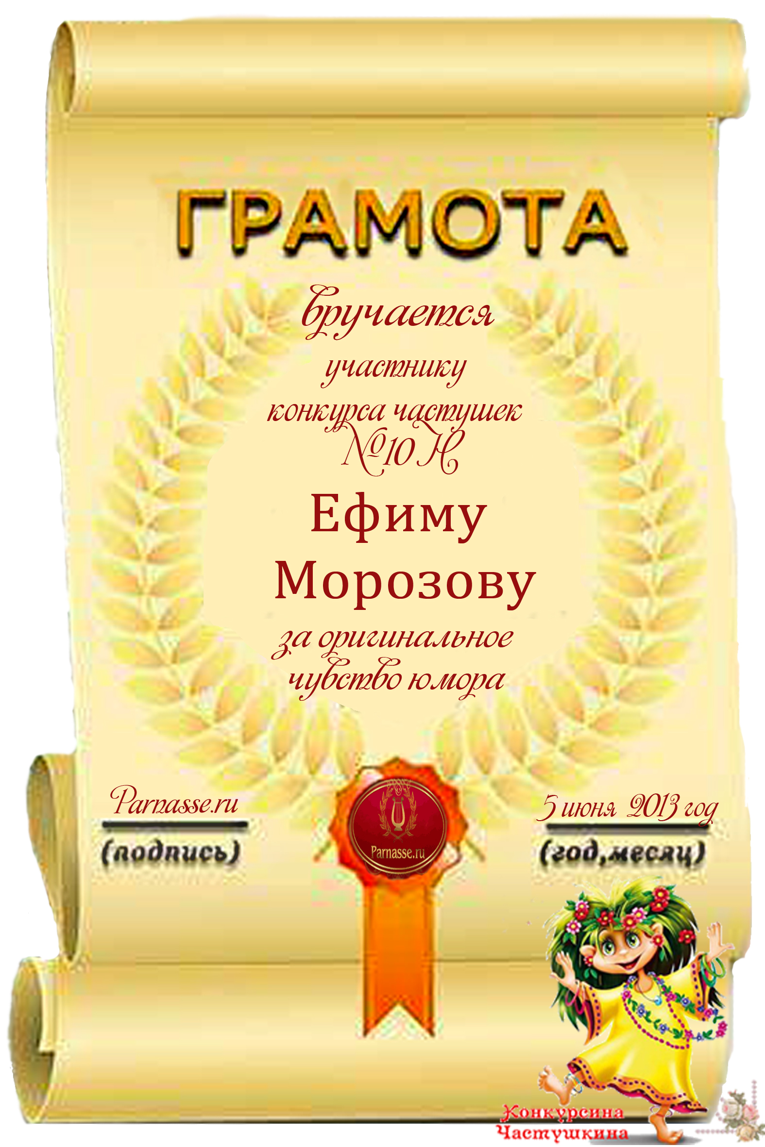 Похвальная грамота за участие в конкурсе лимериков № 20 (17.09.2012 г.)