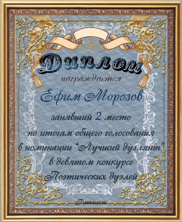 Диплом за 2-е место в номинации "Лучший дуэлянт" по итогам общего голосования в девятом конкурсе поэтических дуэлей