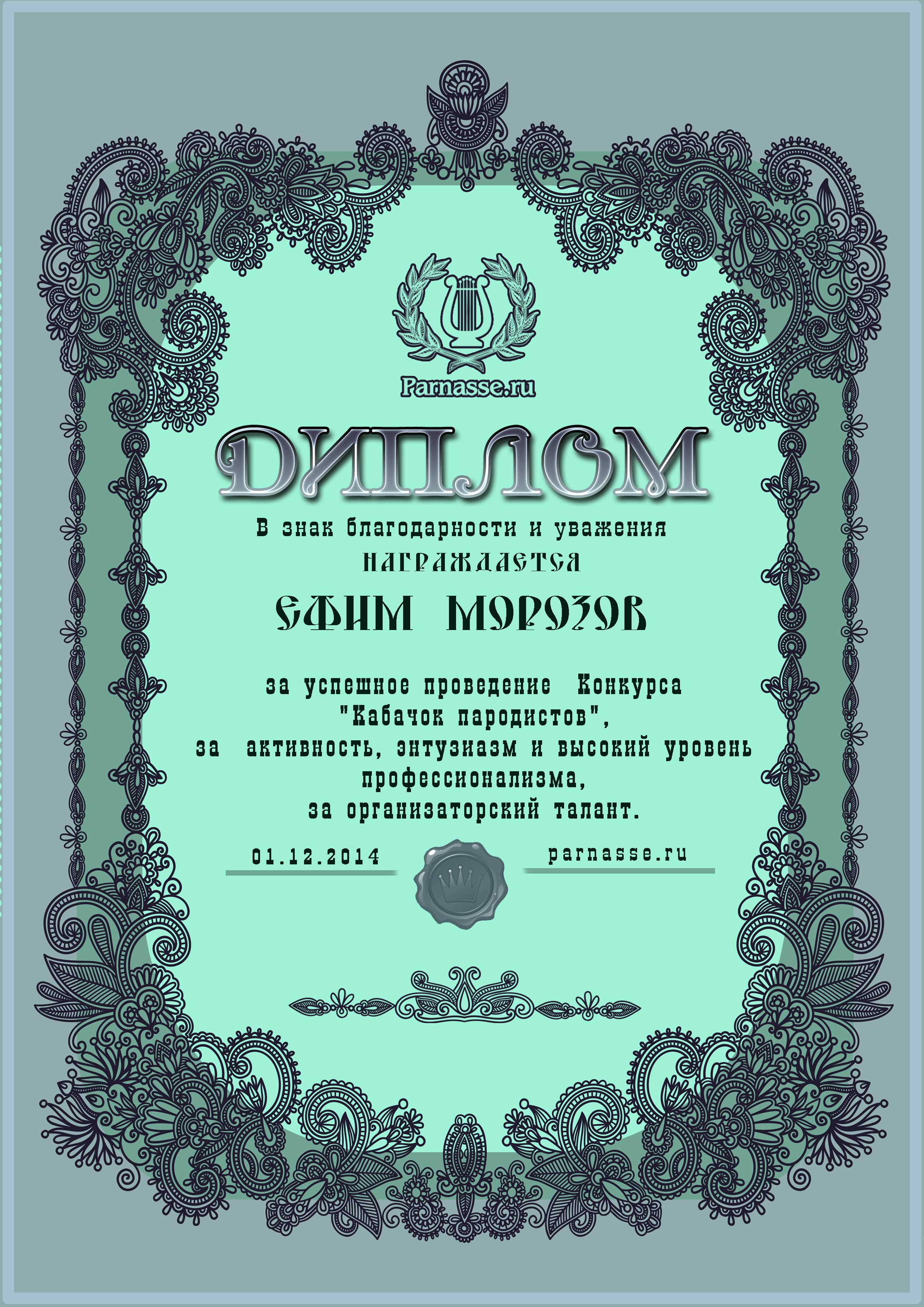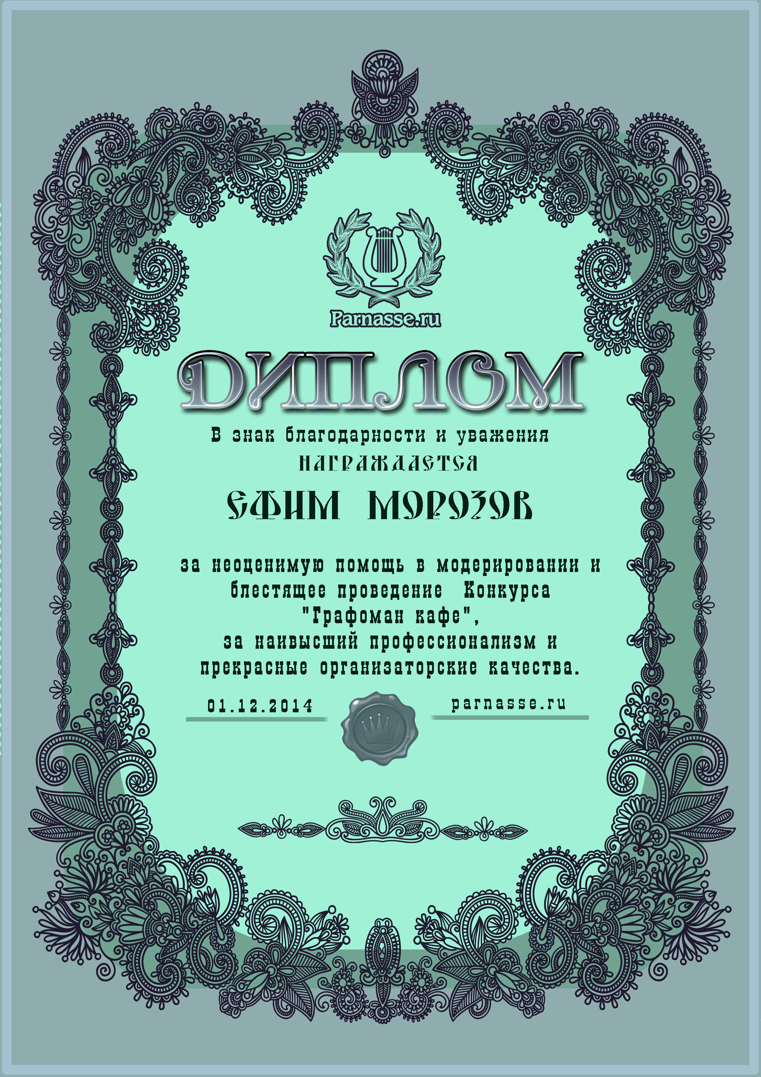 Диплом за победу в номинации "Лучший дуэлянт" в четвёртом конкурсе Поэтических дуэлей