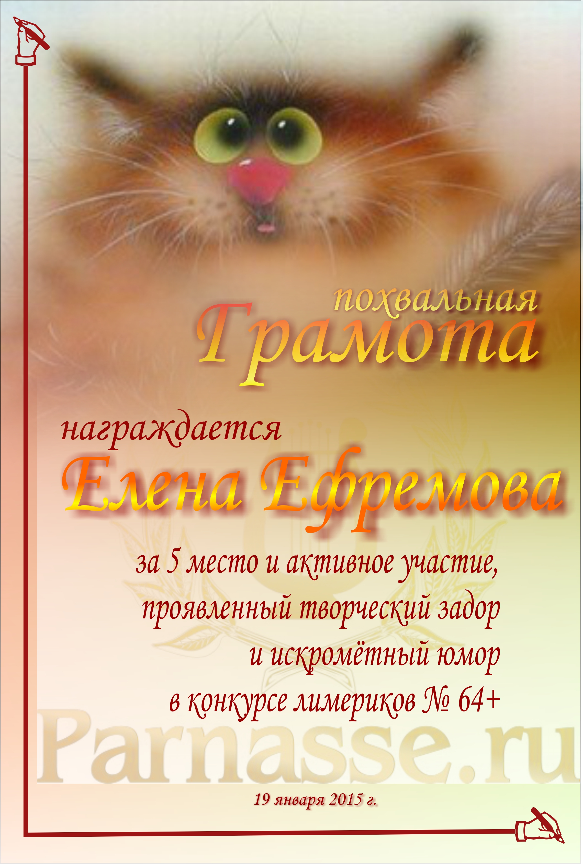 Похвальная грамота за 5 место и активное участие в конкурсе лимериков № 64+ (19.01.2015 г.)