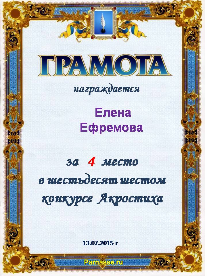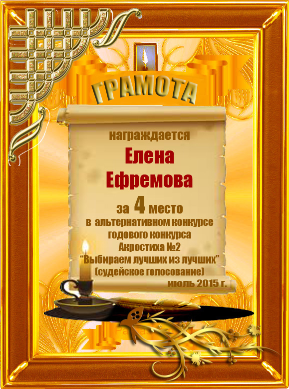 Грамота за 4 место во 2 годовом конкурсе Акростиха по итогам судейского голосования! ПОЗДРАВЛЯЮ!