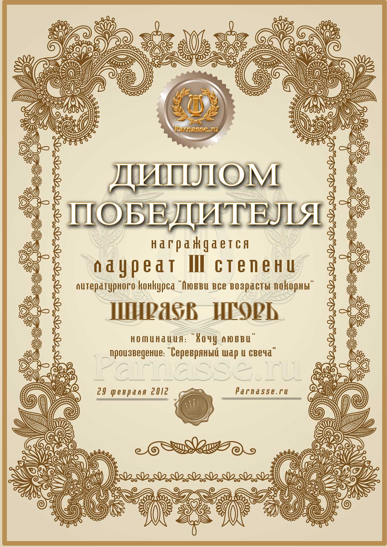 ![]() Лауреат III степени литературного конкурса «Любви все возрасты покорны»!
