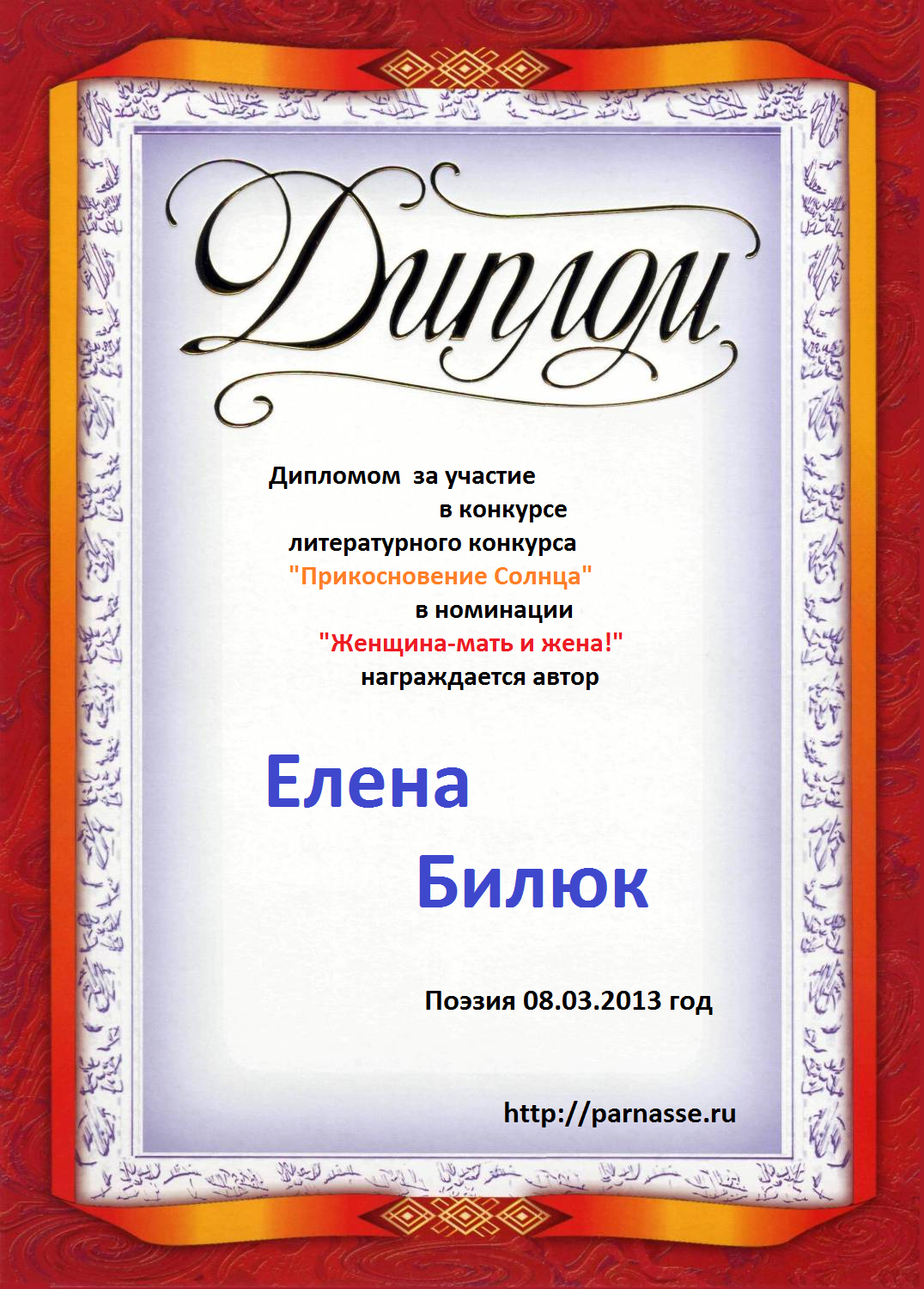 Диплом победителю в конкурсах Акростиха в связи с пятилетием конкурса Акростиха!
