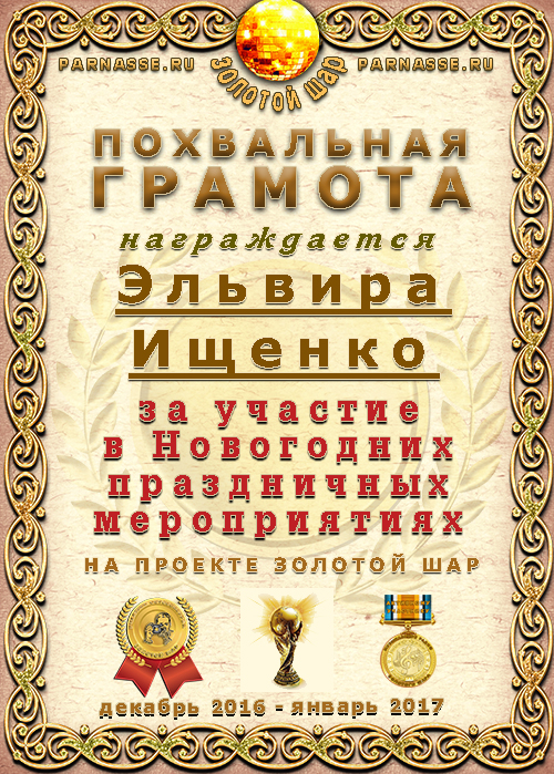 Похвальная Грамота за участие в Новогодних праздничных мероприятиях на проекте "ЗОЛОТОЙ ШАР"!Поздравляем!