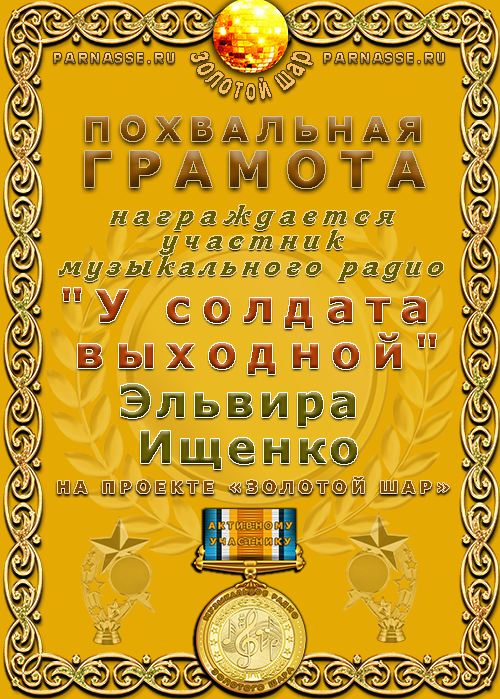 Похвальная грамота за участие на музыкальном радио "У СОЛДАТА ВЫХОДНОЙ"