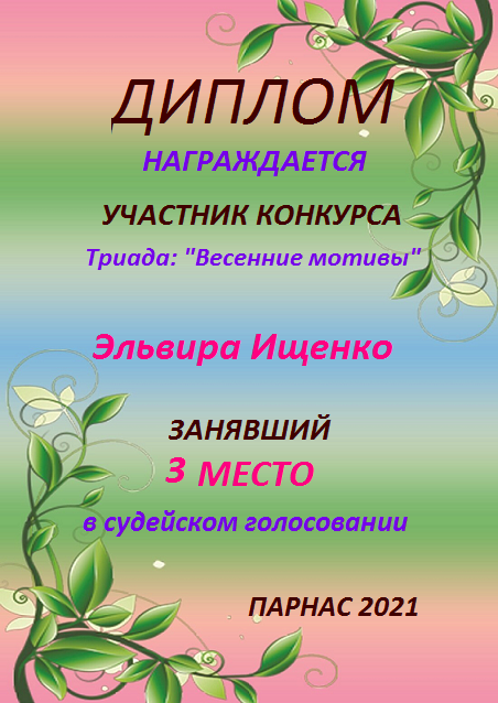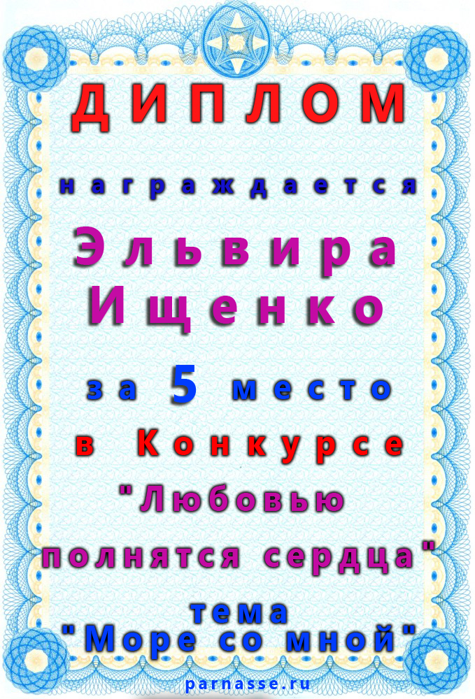 Эльвира,поздравляем с занятым 3 местом в номинации Стихи о море "О, море-море, ты красиво!" - народное голосование! Желаем новых творческих побед!