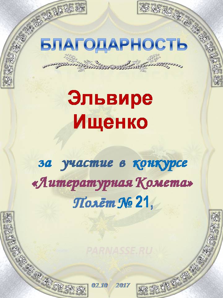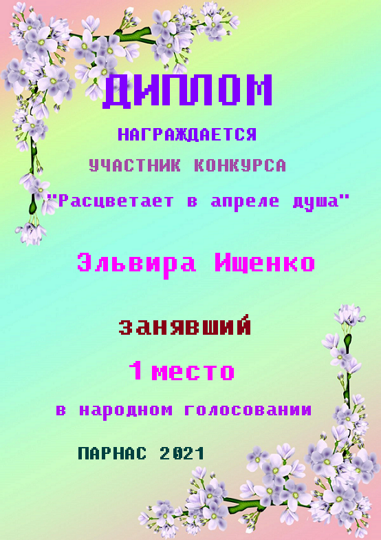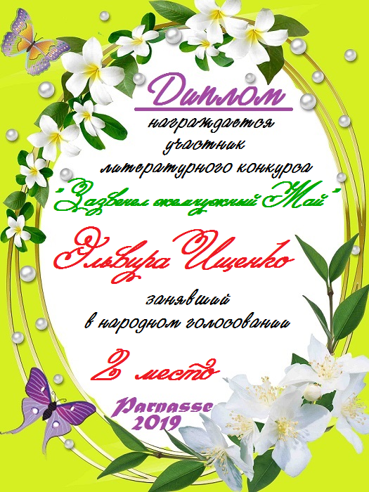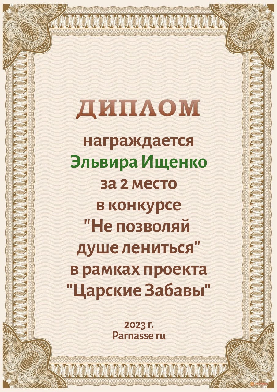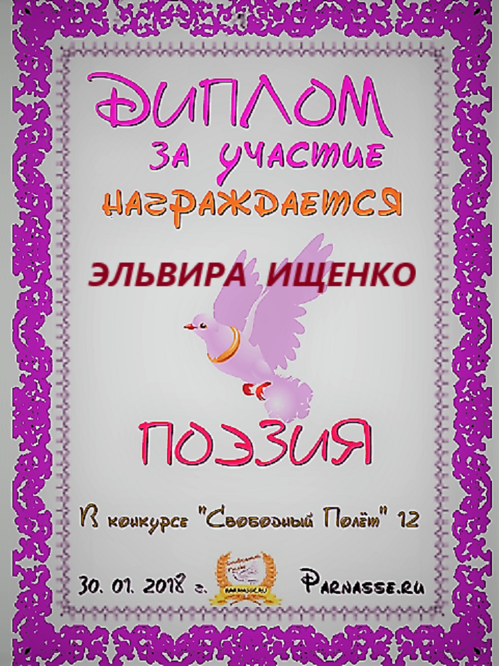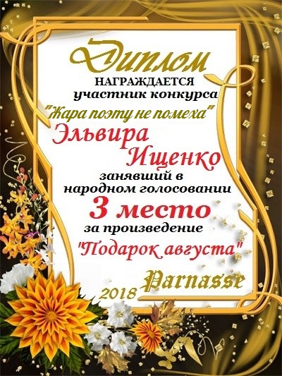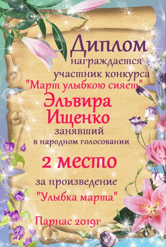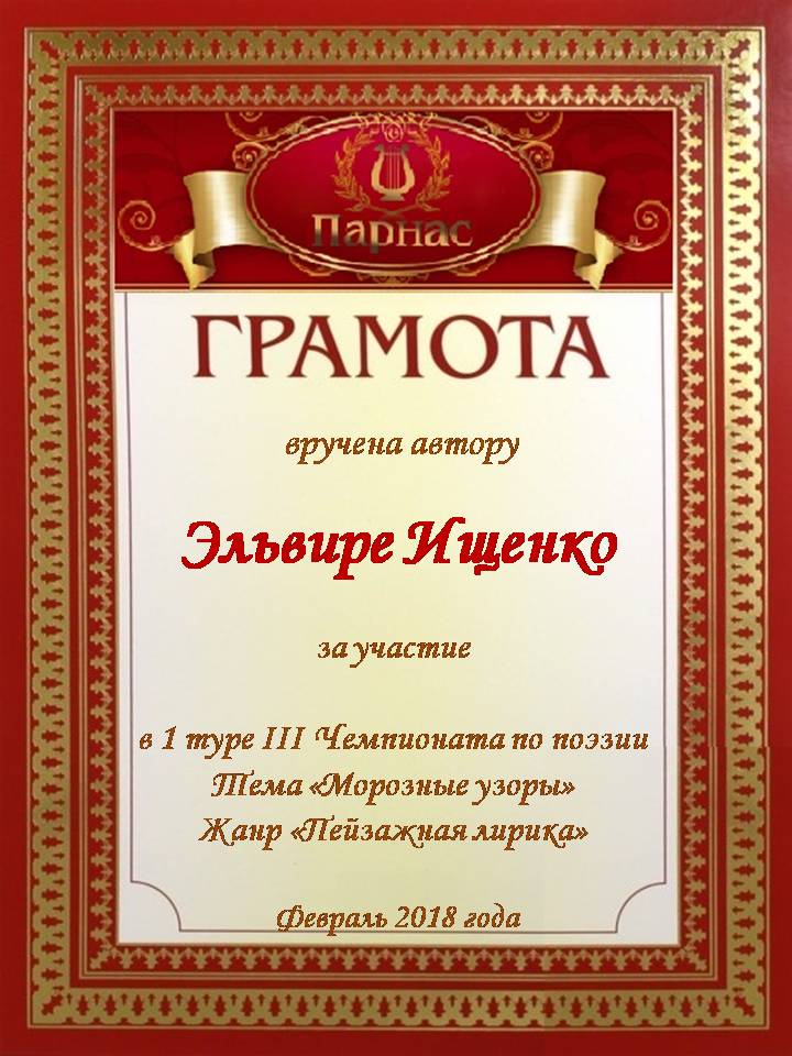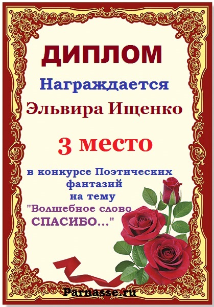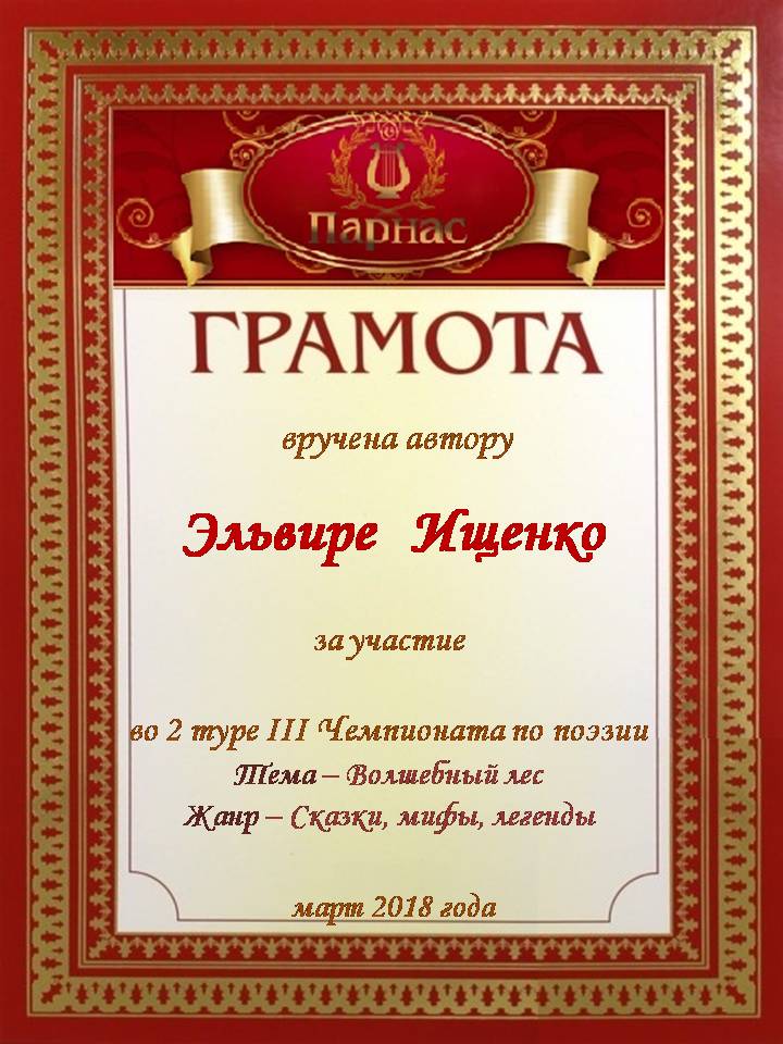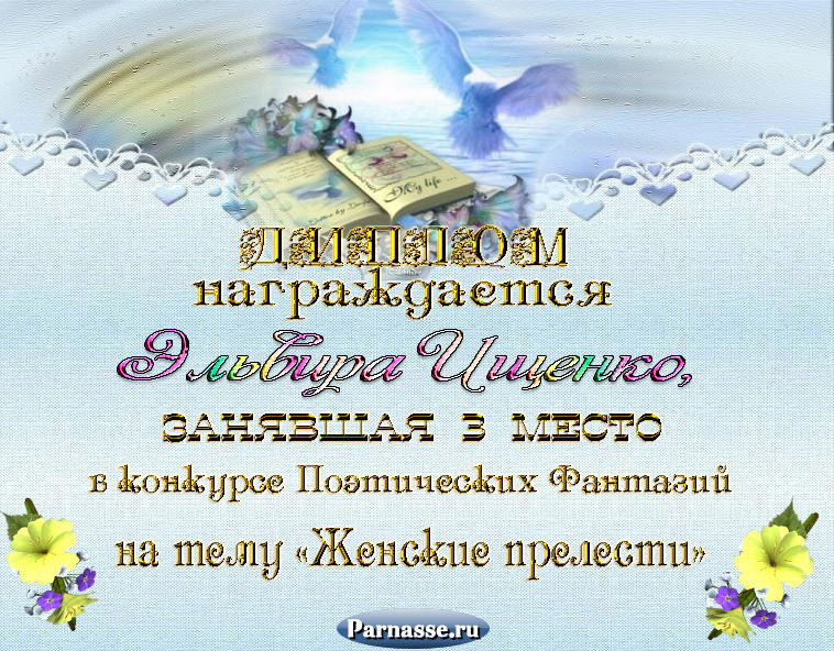 За неугасающую и неисчерпаемую творческую активность, постоянный контакт с Музой и признание сообществом "Парнасцев".От всей души желаем Вам, Эльвира, здоровья, любви, успехов, благополучия, удачи и творческого вдохновения!