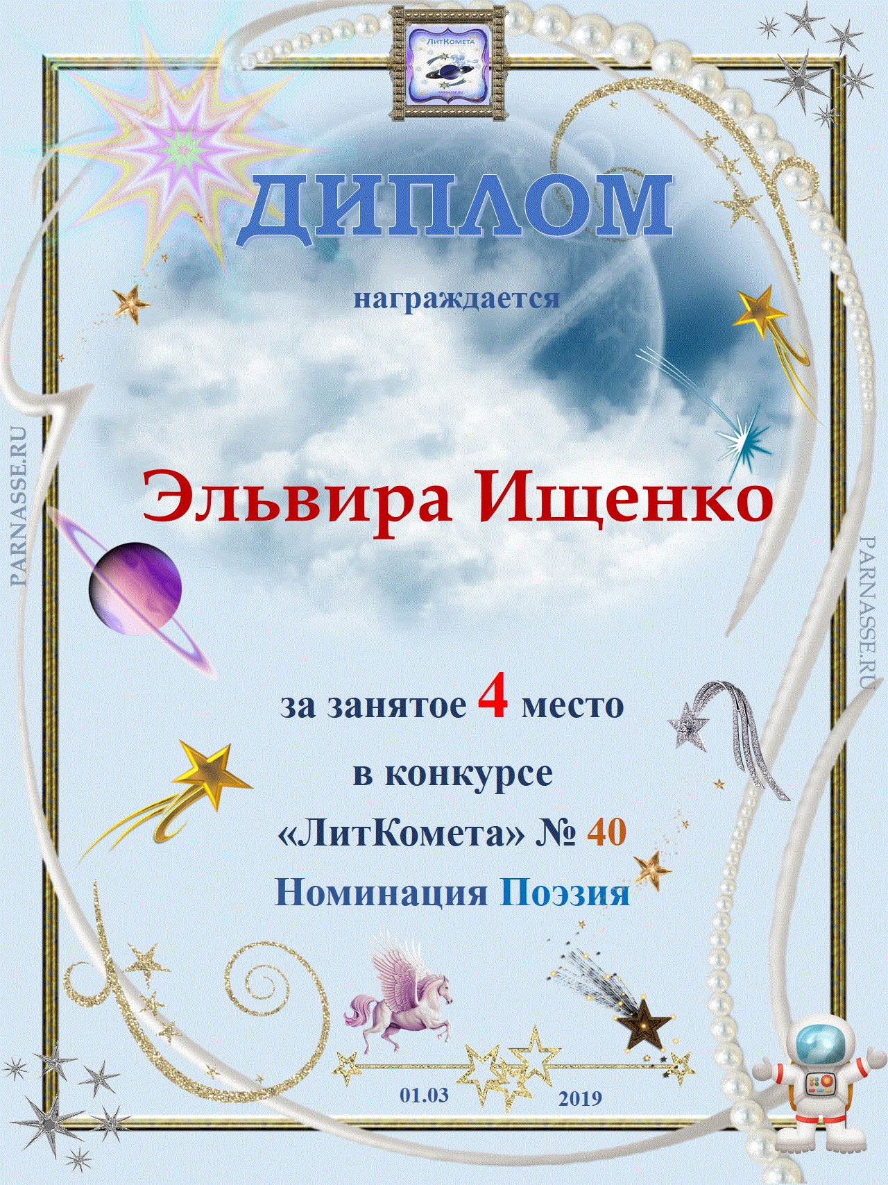 Поздравляю с занятым 4 местом в конкурсе "Литературная Комета - Полёт № 54" - Номинация Поэзия!