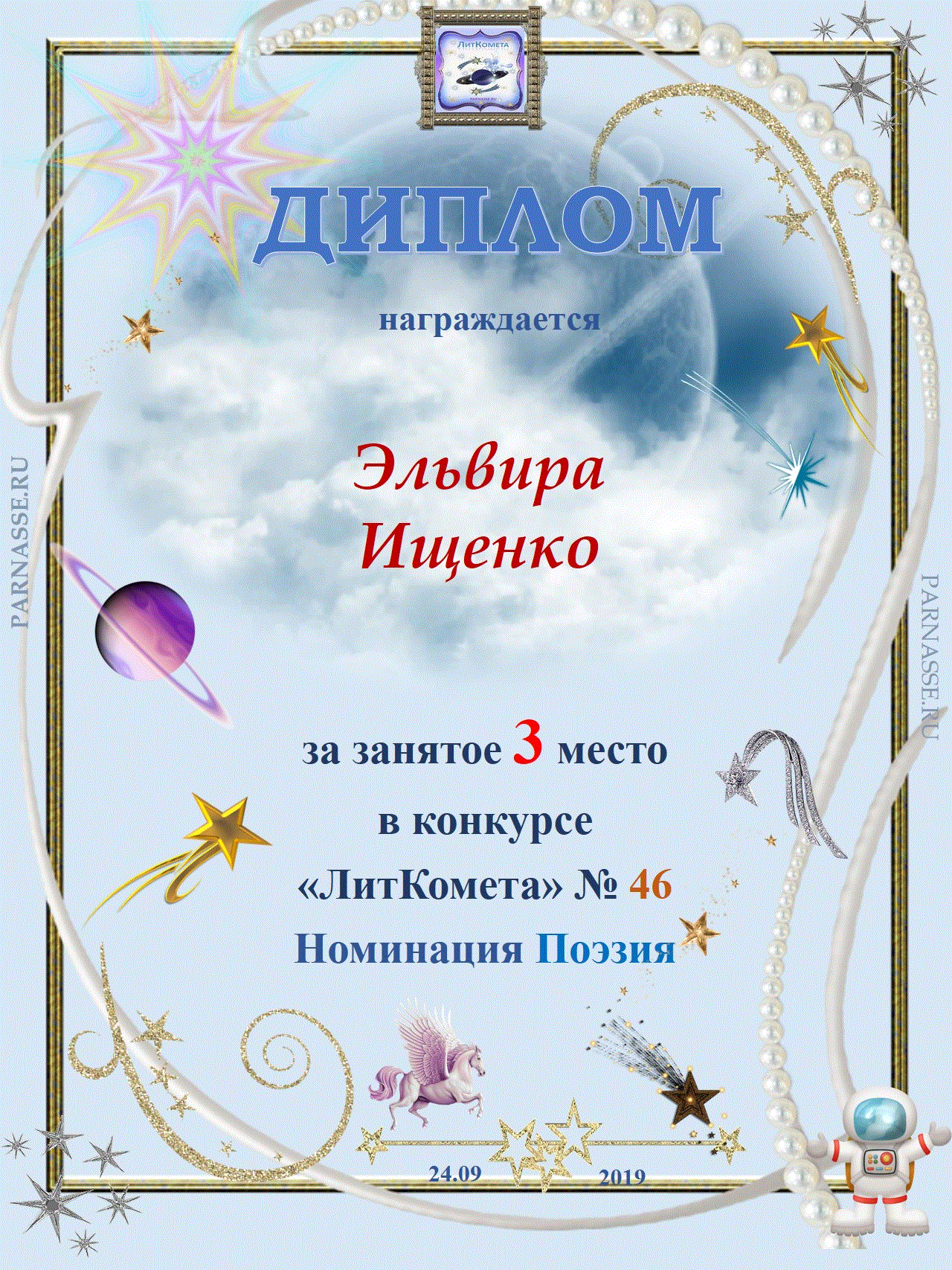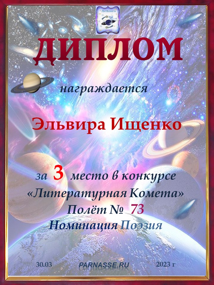 Поздравляю с занятым 3 местом в конкурсе "ЛитКомета-Полёт № 73" - Номинация Поэзия!