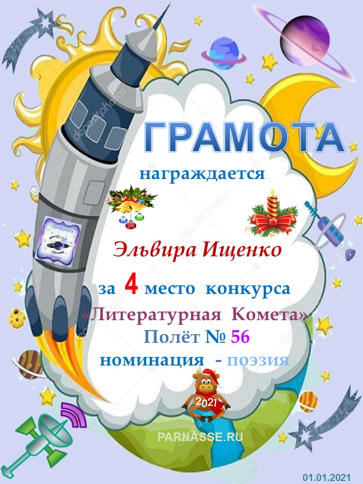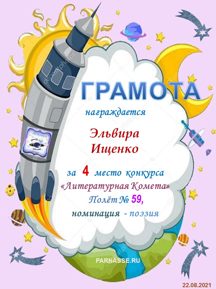 Поздравляю с занятым 4 местом в конкурсе "Литературная Комета - Полёт № 59" Номинации Поэзия!