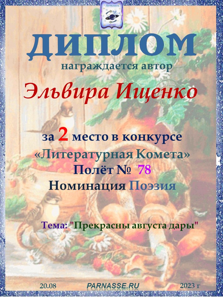 Поздравляю с занятым 2 местом в конкурсе "ЛитКомета-Полёт № 65" в Номинации Поэзия!