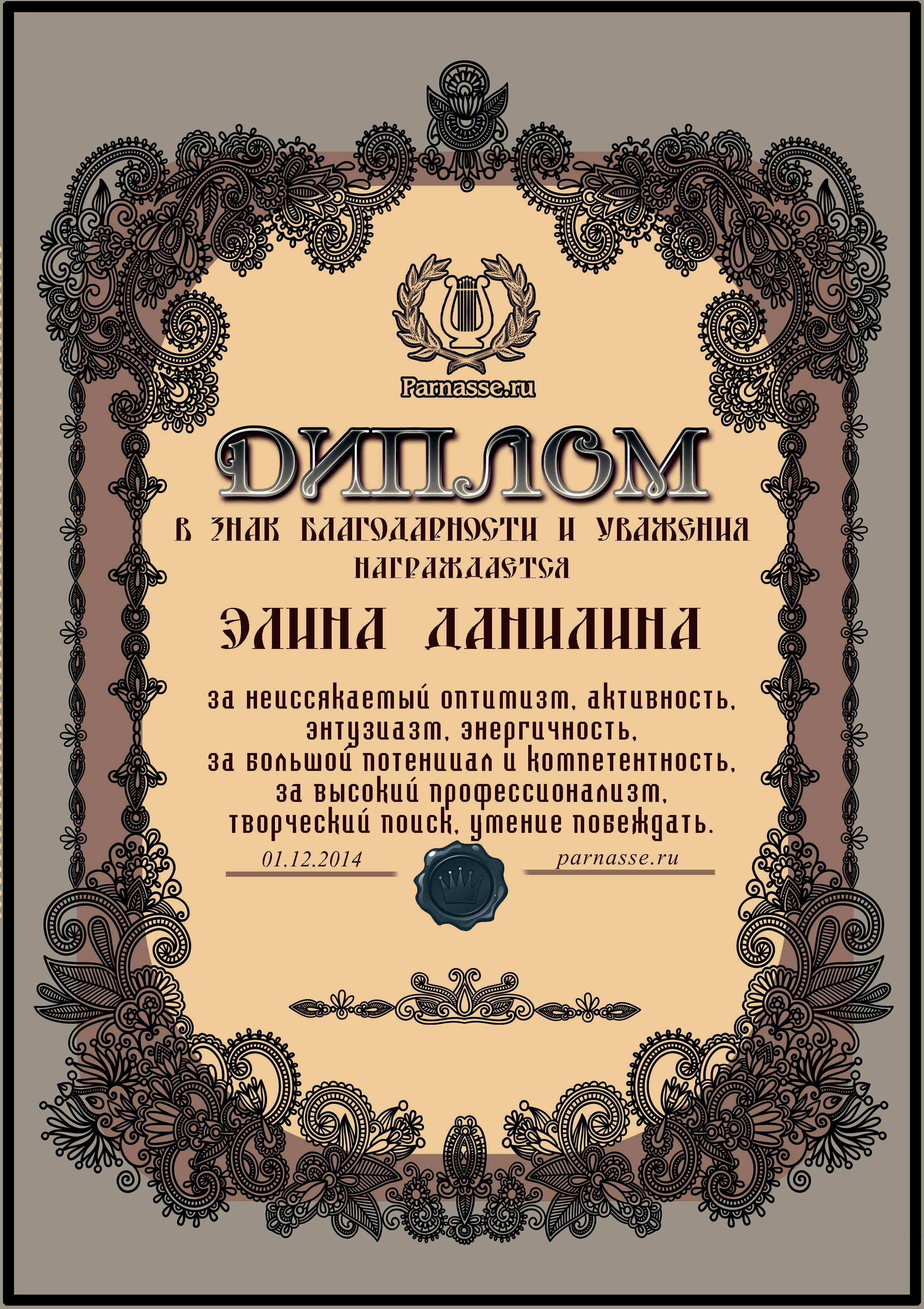 За неугасающую и неисчерпаемую творческую активность, постоянный контакт с Музой и признание сообществом "Парнасцев".От всей души желаем Вам, Элина, здоровья, любви, успехов, благополучия, удачи и творческого вдохновения!