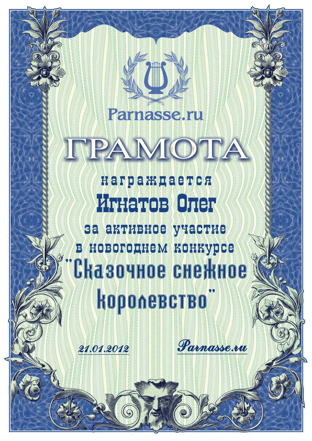 От лица Администрации творческого портала "Парнас" вручаем Вам этот памятный знак с самыми наилучшими пожеланиями! Пусть Вас весь год не покидает творческий запал, удача, а здоровье будет столь же крепким и нерушимым, как и традиция Новогоднего праздника! Счастья, успехов и любви Вам и Вашей семье, друзьям и близким!