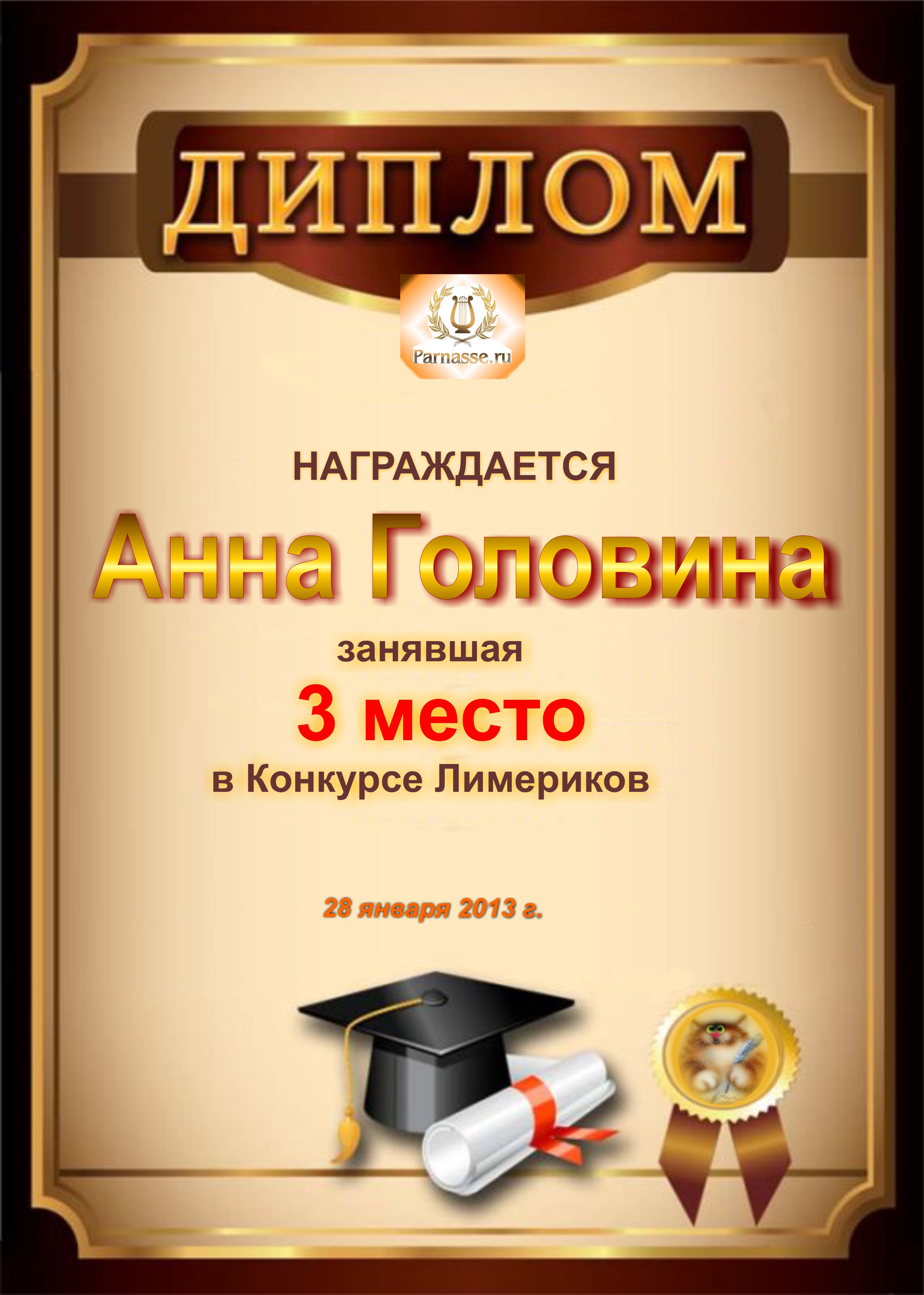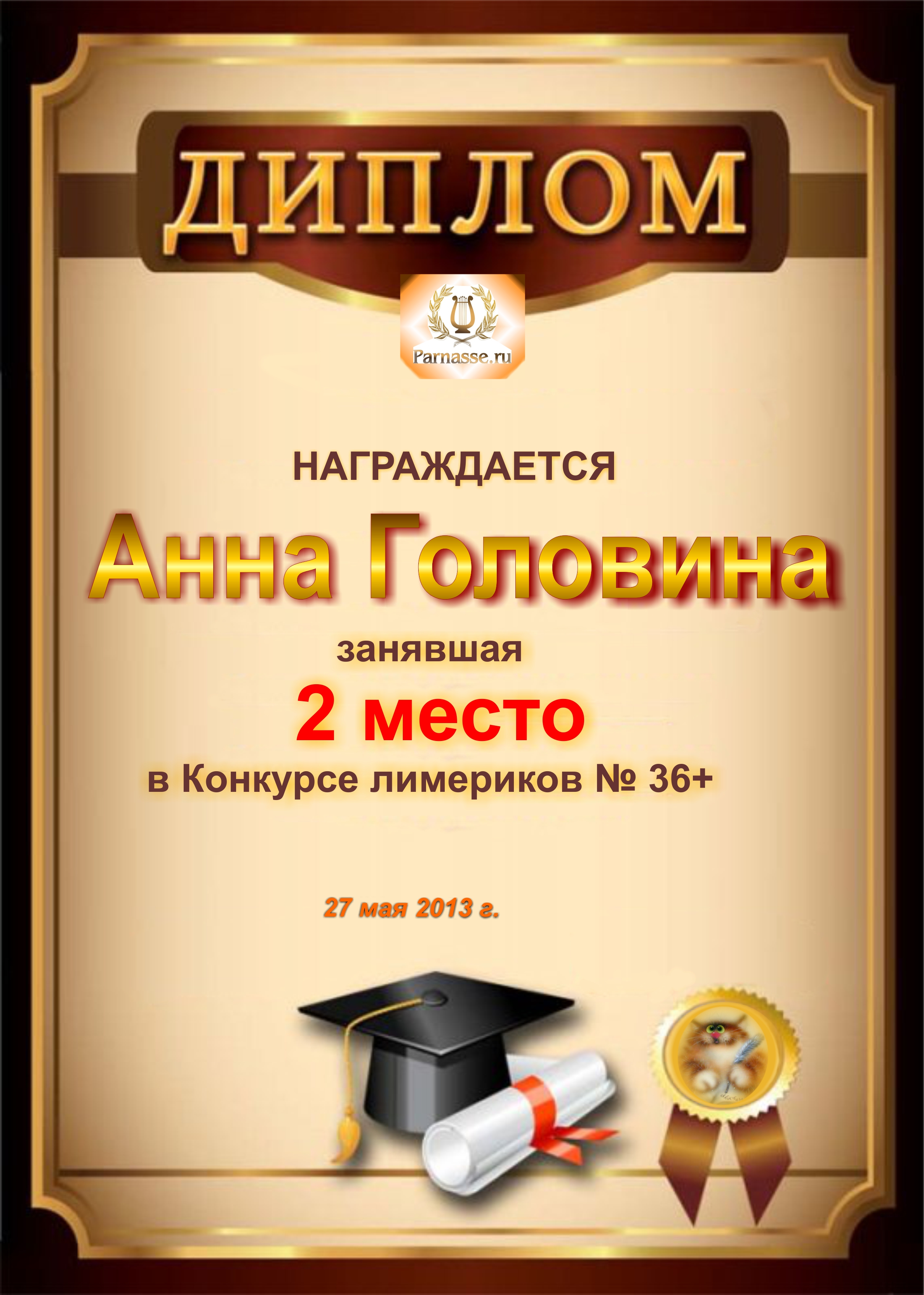 Диплом за победу и 2 место в дополнительной номинации конкурса лимериков № 36+ (27.05.2013 г.)
