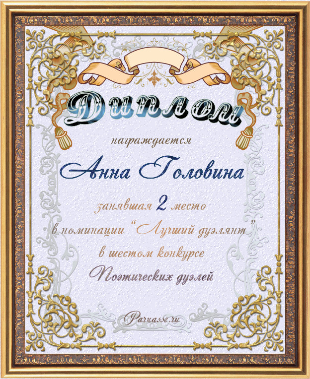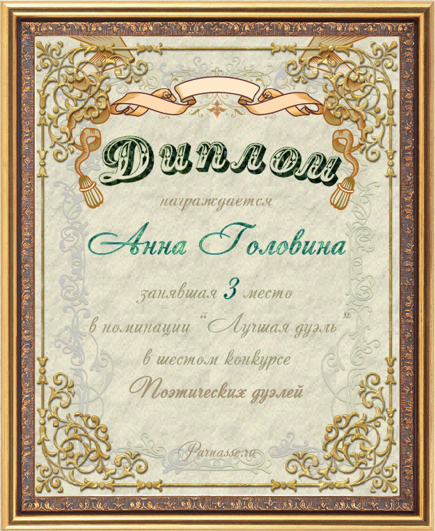 Диплом за третье место в номинации "Лучшая дуэль" в шестом конкурсе поэтических дуэлей (дуэль 8.1)