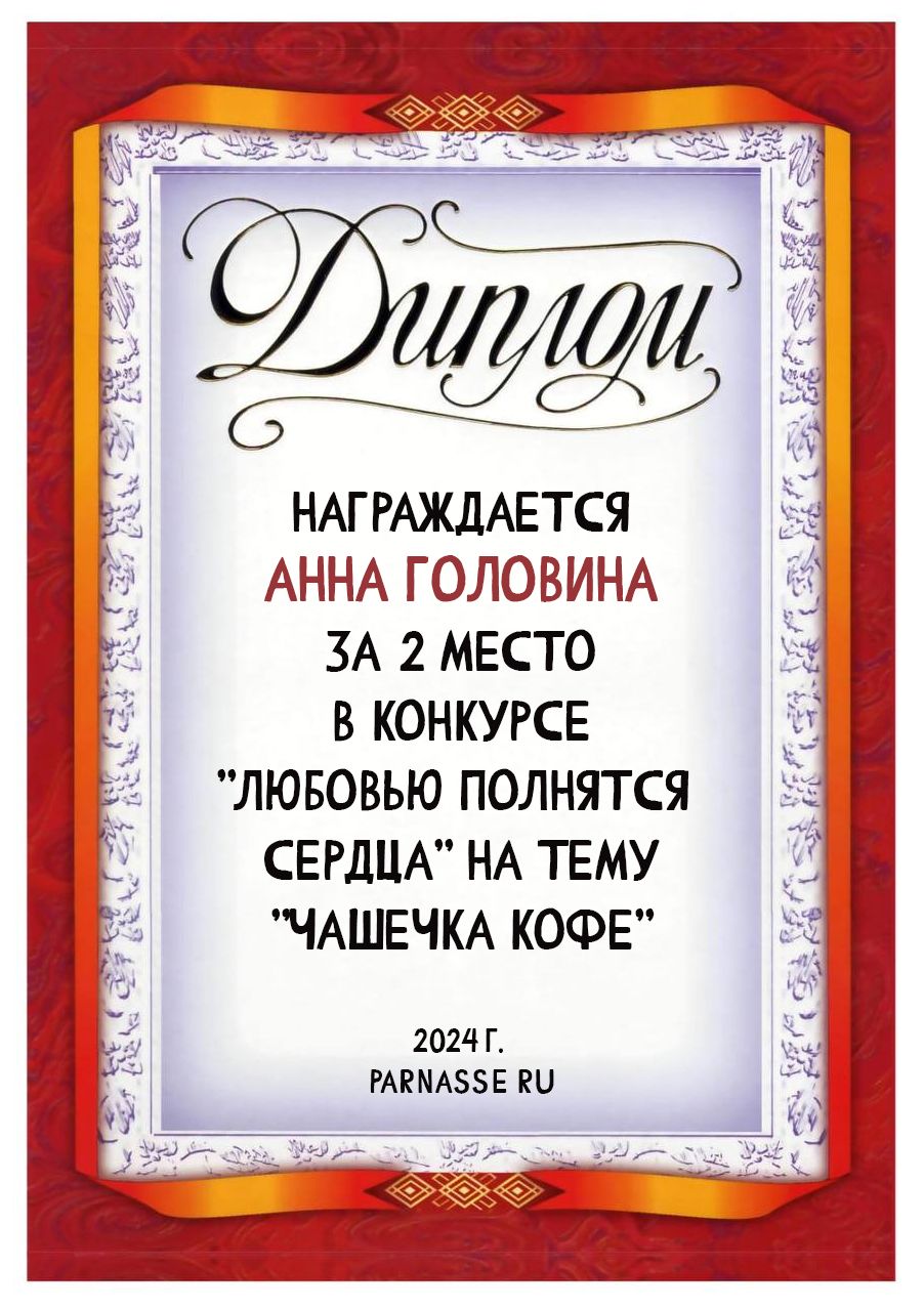 2 место в конкурсе "Любовью полнятся сердца" на тему "Чашечка кофе". Поздравляем!