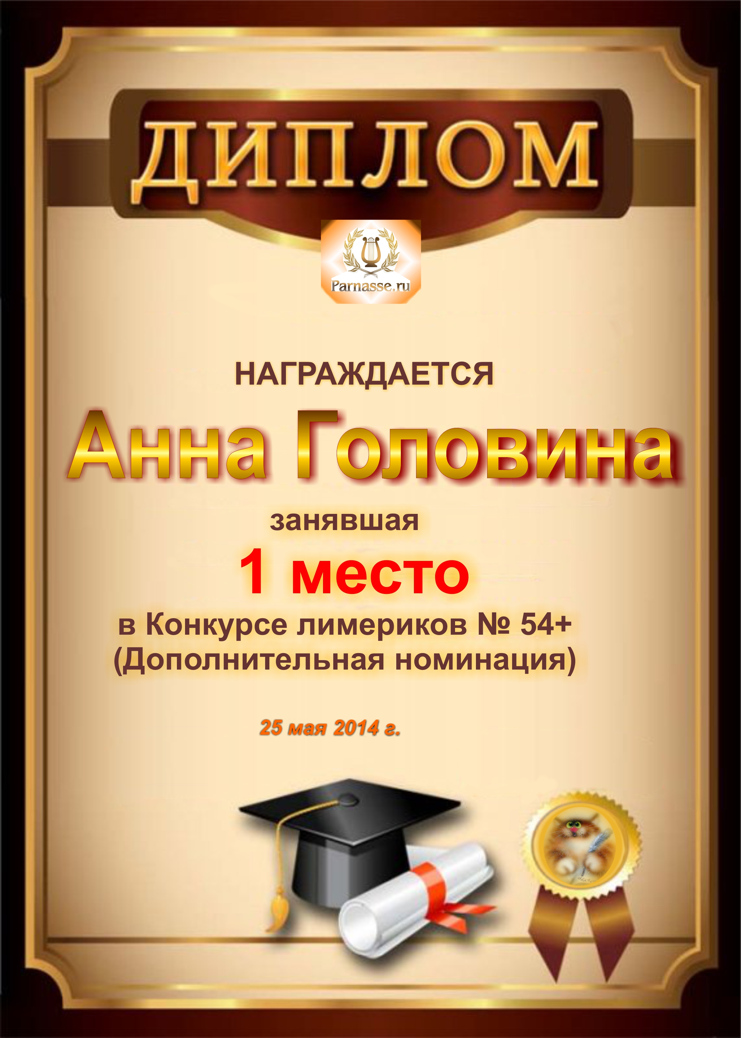 Диплом за победу и 1 место в дополнительной номинации конкурса лимериков № 54+ (25.05.2014г.)