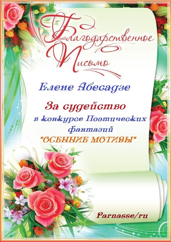 Уважаемая Елена!Спасибо Вам большое за высокопрофессиональное, объективное судейство конкурсов на Парнасе!