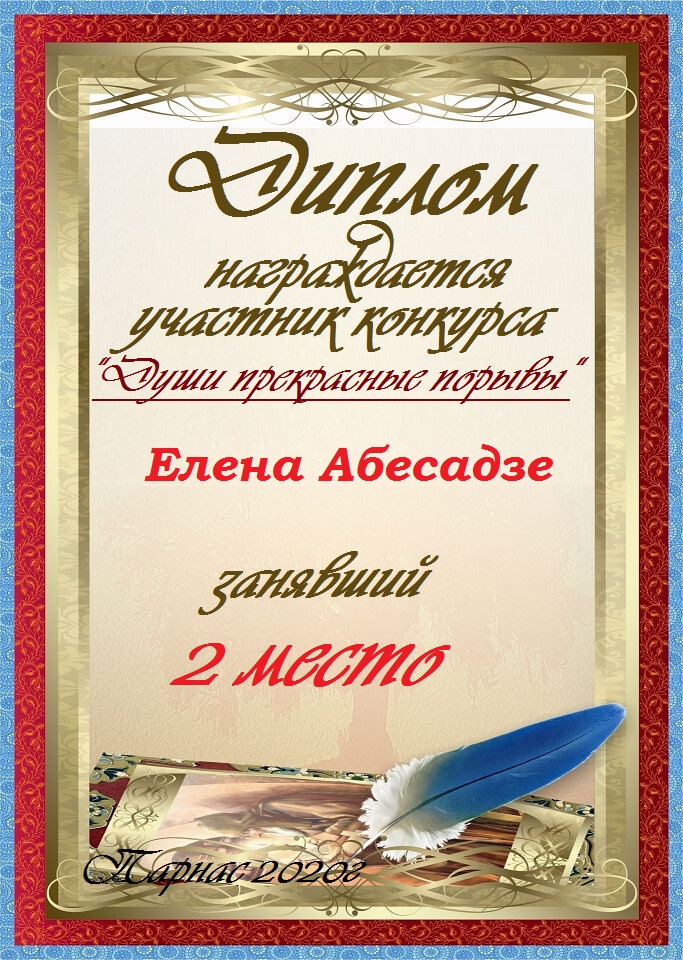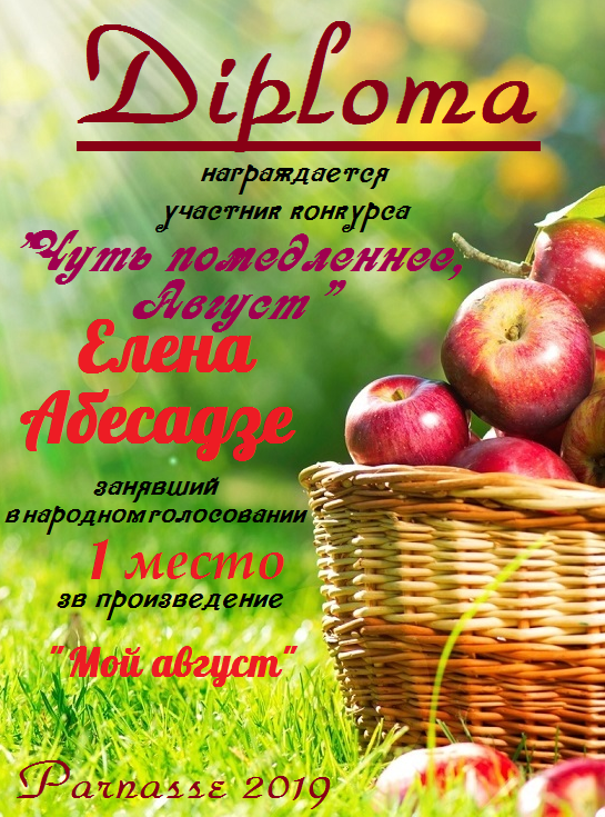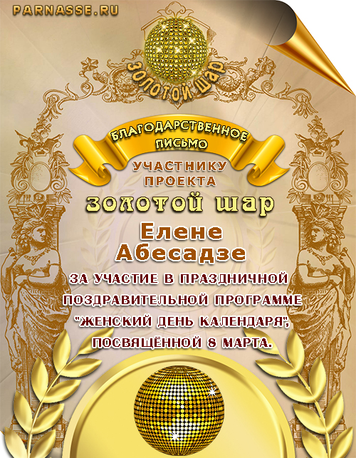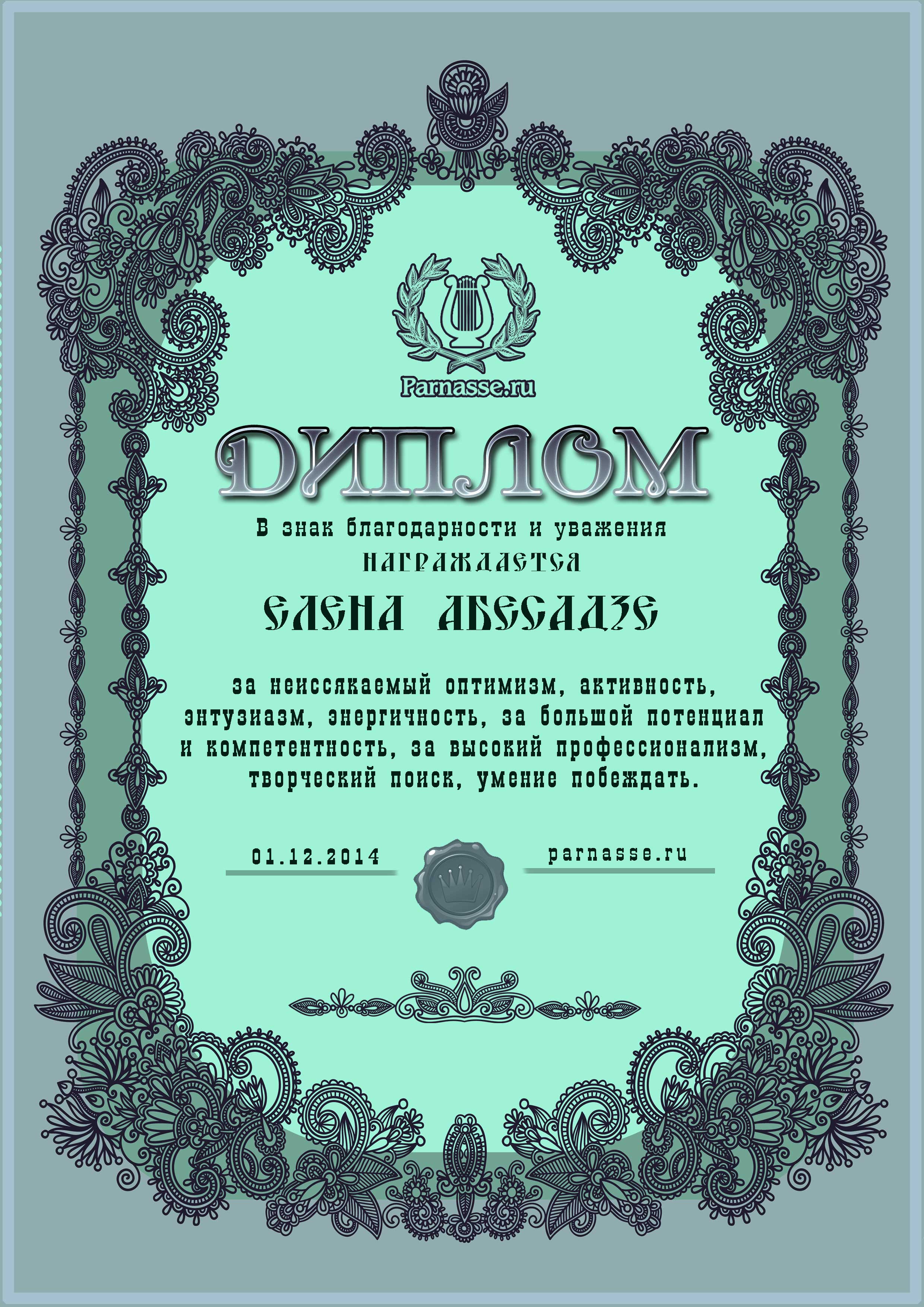 За неугасающую и неисчерпаемую творческую активность, постоянный контакт с Музой и признание сообществом "Парнасцев".От всей души желаем Вам, Елена, здоровья, любви, успехов, благополучия, удачи и творческого вдохновения!