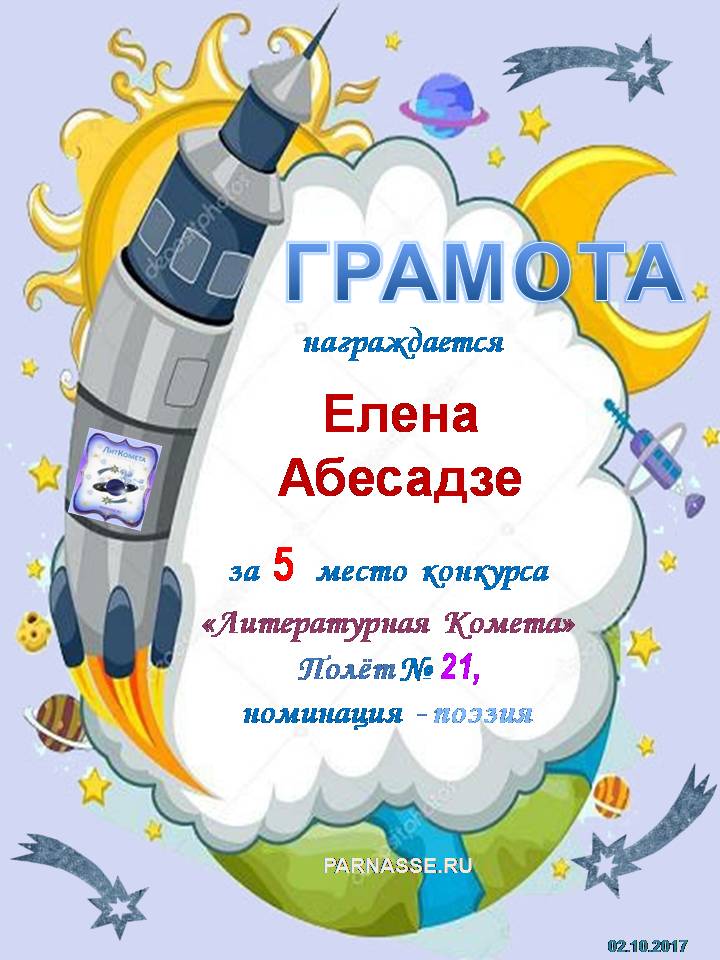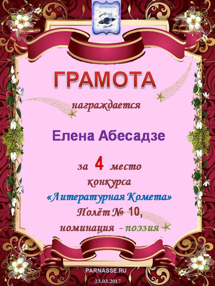 Поздравляю с занятым 4 местом в конкурсе "Литературная Комета - Полёт № 31" номинации Поэзия!