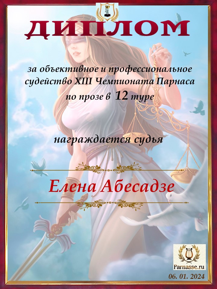 Спасибо за объективное и профессиональное судейство в 12 туре XIII Чемпионате Парнаса по прозе!