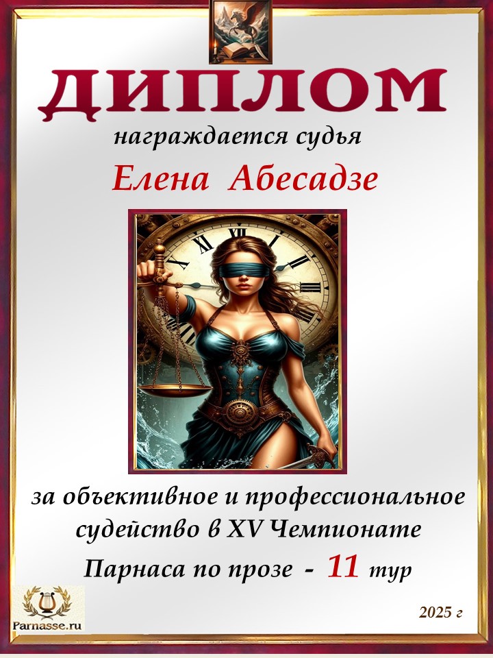 ![]() Медаль судьи в 11 туре XV Чемпионата Парнаса по прозе