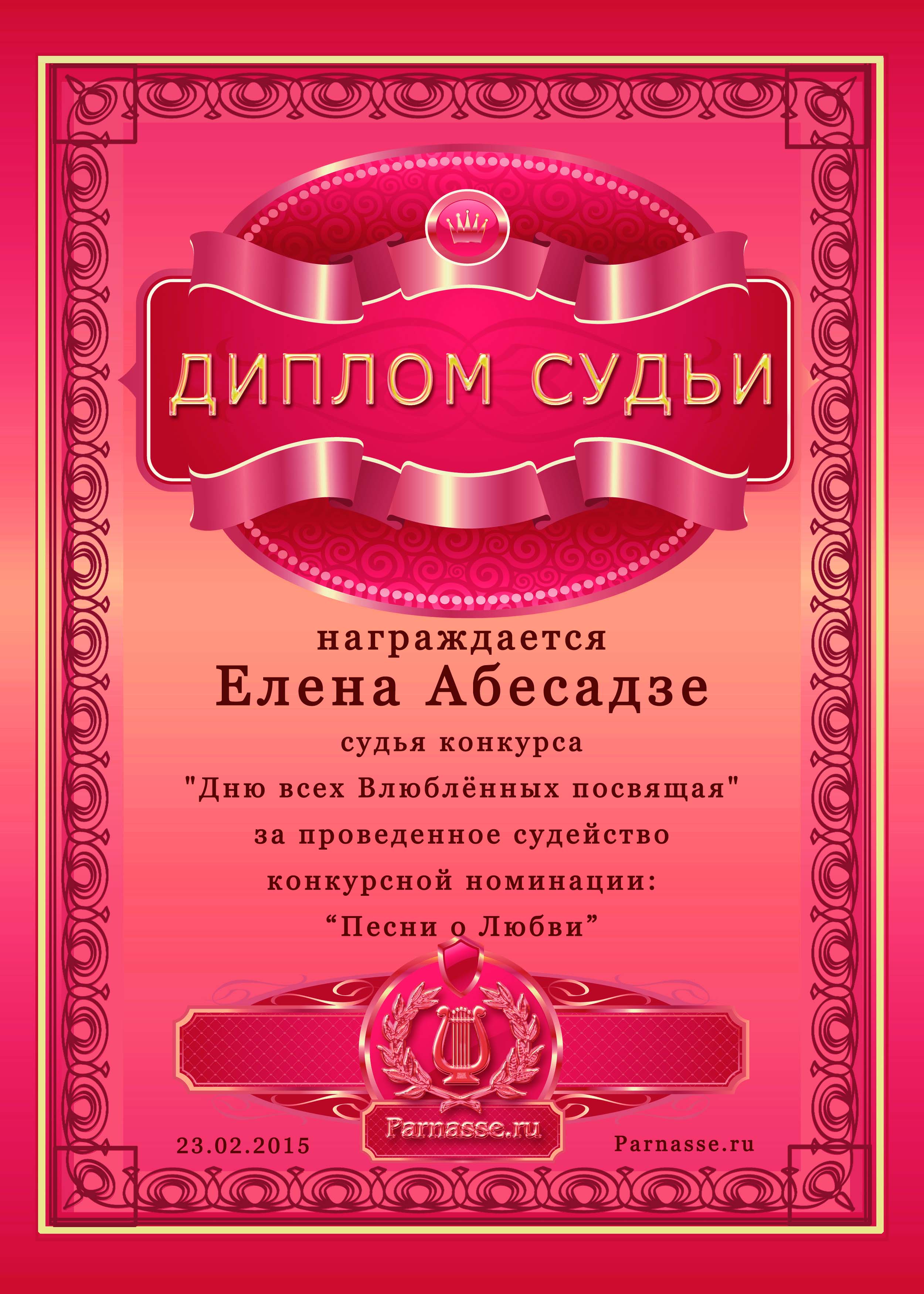 Диплом за профессиональное судейство конкурса "Дню всех Влюблённых посвящая".