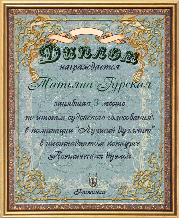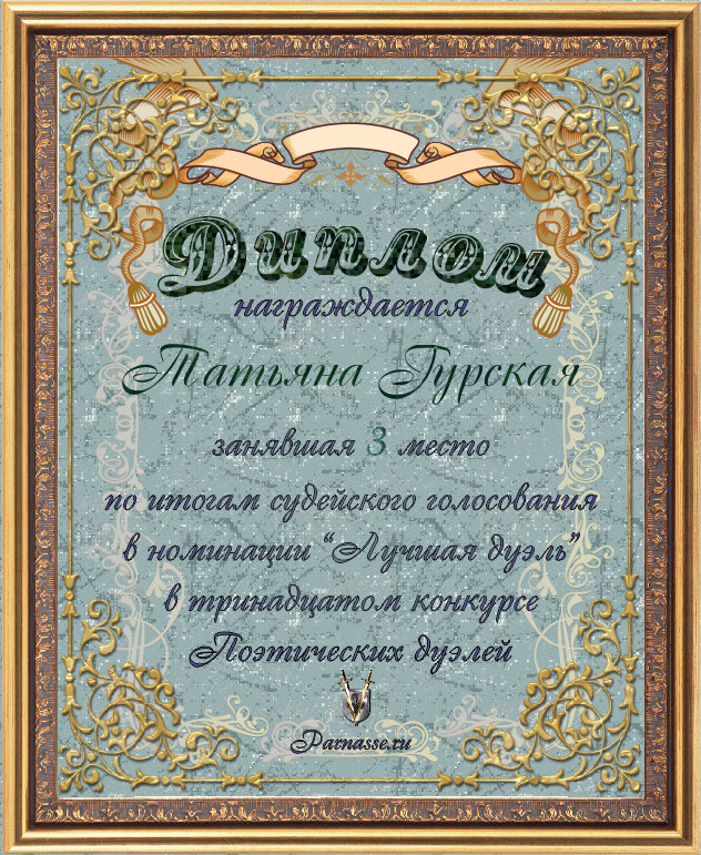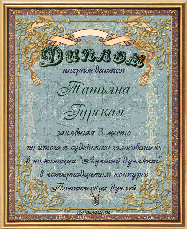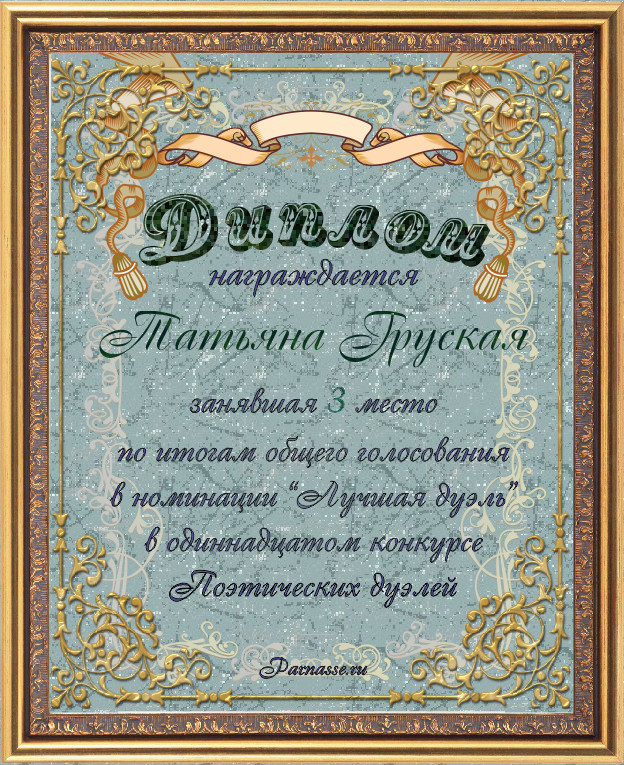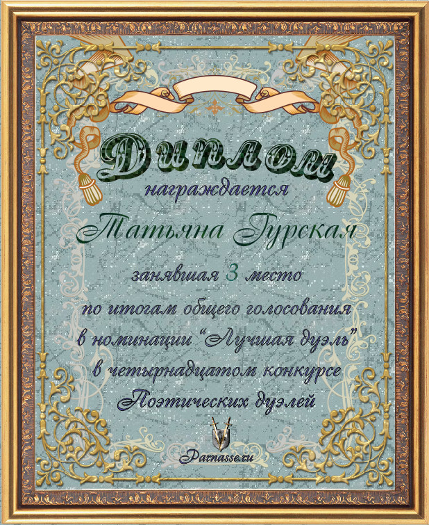 Диплом за 3-е место в номинации "Лучшая дуэль" по итогам общего голосования в одиннадцатом конкурсе поэтических дуэлей (№ 6.2)