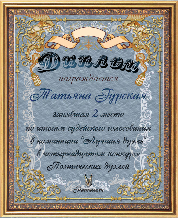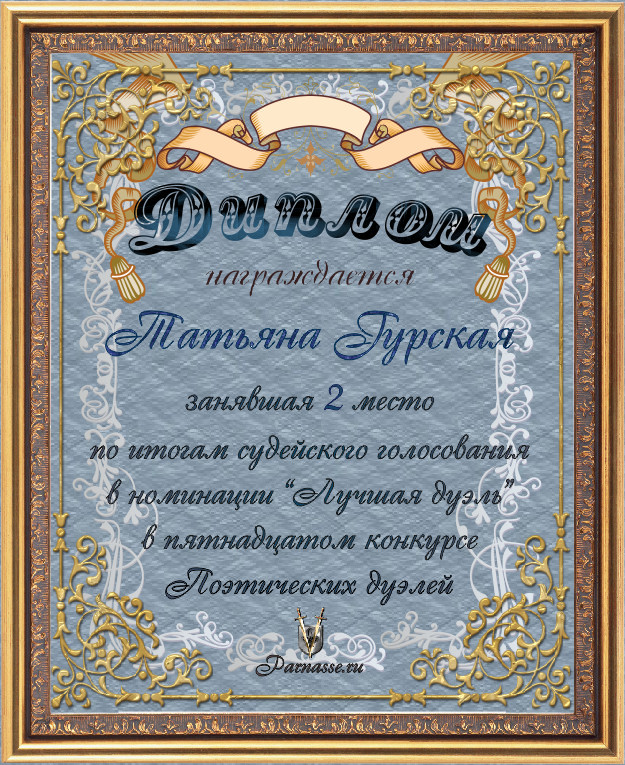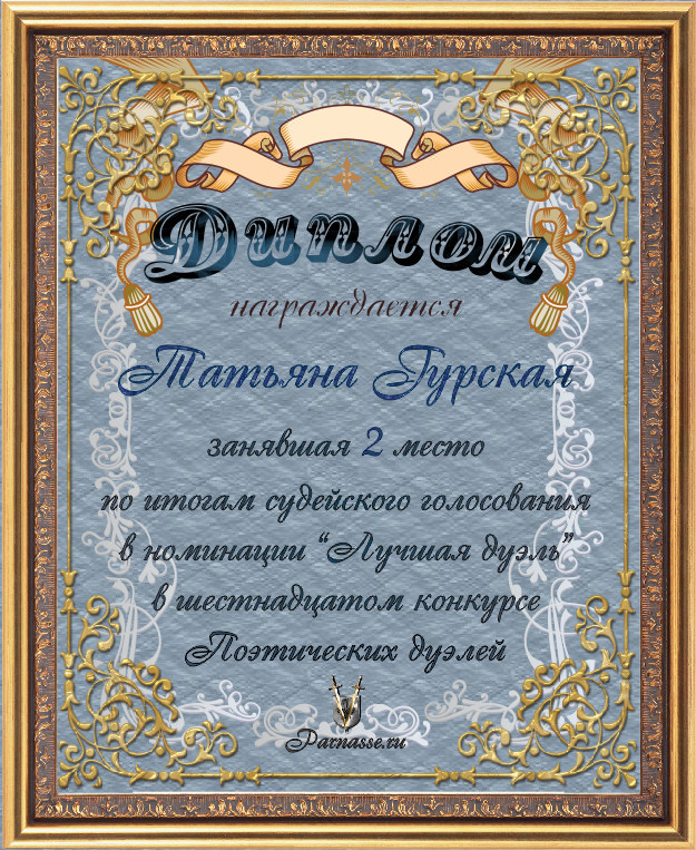 Диплом за 2-е место в номинации "ЛУЧШАЯ ДУЭЛЬ" по итогам судейского голосования в 16ом конкурсе поэтических дуэлей (№ 5.1)